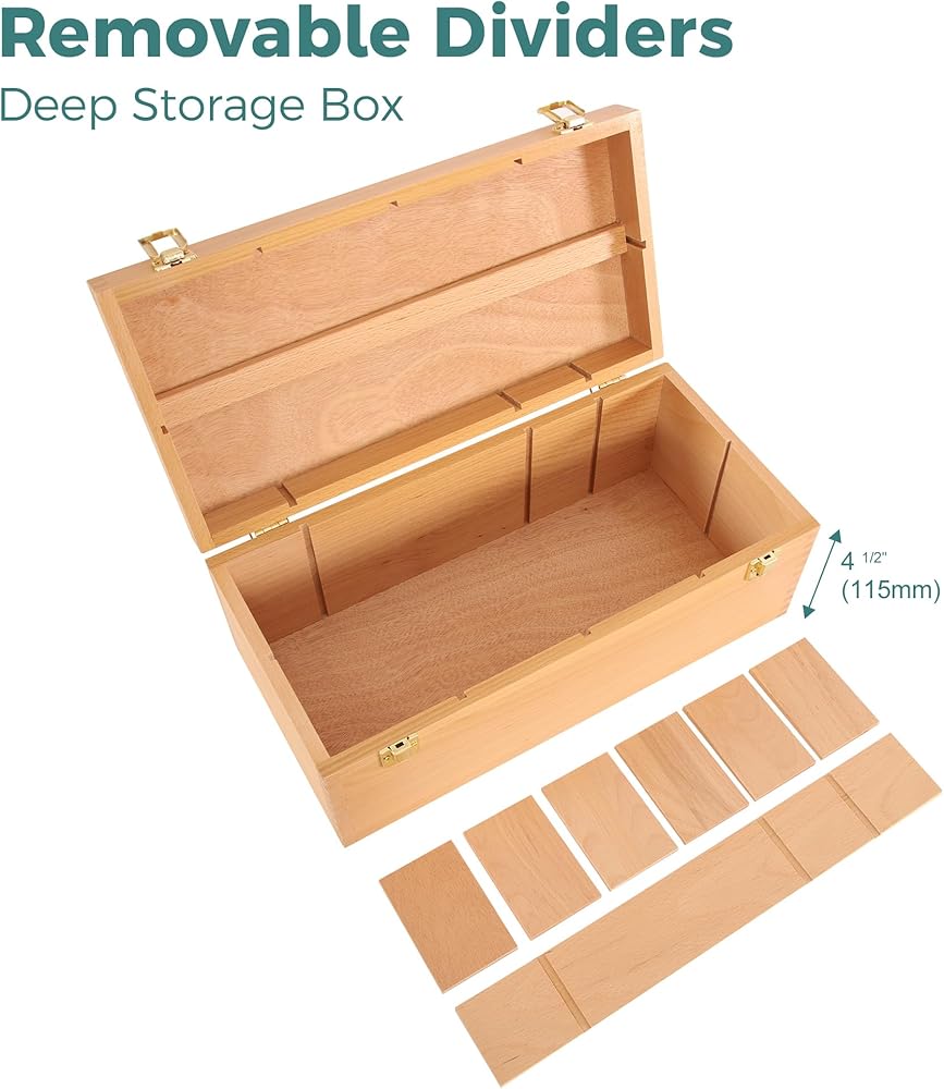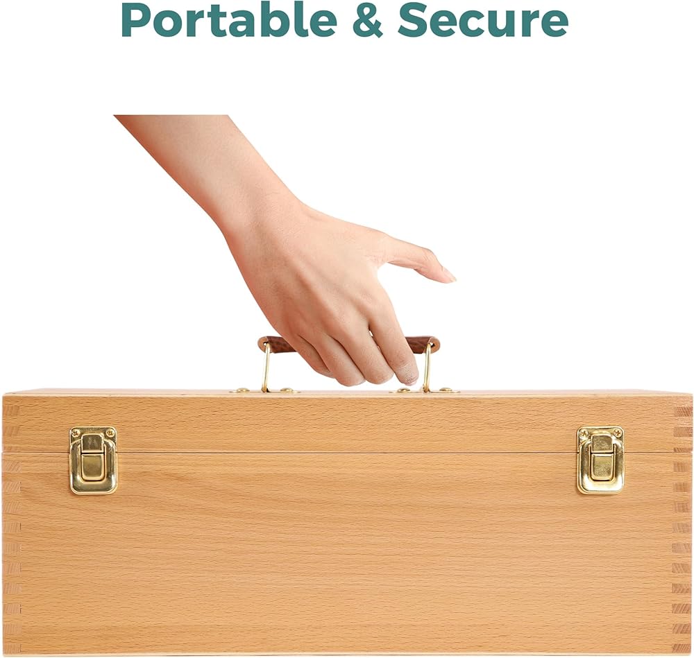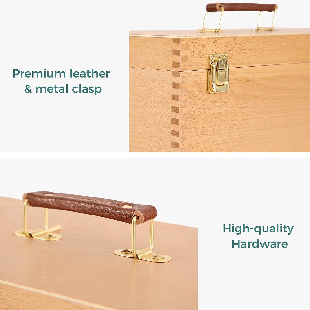 [خشب الزان الألماني الفاخر] مصنوع من خشب الزان عالي الجودة، تم تصميم هذا الصندوق الخشبي ليكون قويًا ومتينًا، مما يضمن أداء طويل الأمد. يضمن استخدام المواد المتميزة أن الصندوق يمكنه تحمل قسوة تخزين ونقل اللوازم الفنية الخاصة بك. الألوان الطبيعية الجميلة وأنماط حبيبات خشب الزان، توفر جمالاً أنيقًا وخالدًا، وتضيف لمسة من الرقي إلى الاستوديو الفني أو مكان العمل الخاص بك.