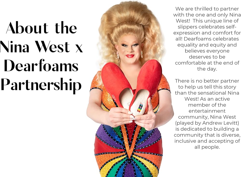 • WHY THE PARTNERSHIP: Dearfoams proudly makes comfortable slippers and shoes for all. As a brand, we take pride in our community and value the importance of diversity and inclusion. There is no better partner to help us tell this story than the sensational Nina West! As an active member of the entertainment community, Nina West (played by Andrew Levitt) is dedicated to building a community that is diverse, inclusive and accepting of all people.
