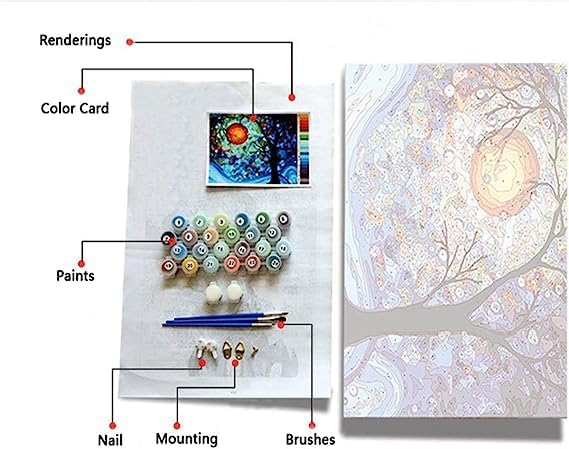 تشتمل مجموعات الطلاء بالأرقام على: قطعة واحدة من القماش عالي الجودة مقاس 16 × 20 بوصة (بدون إطار)، 3 فرش بأحجام مختلفة، مجموعة واحدة من طلاءات الأكريليك، مواد صديقة للبيئة وآمنة مختارة
