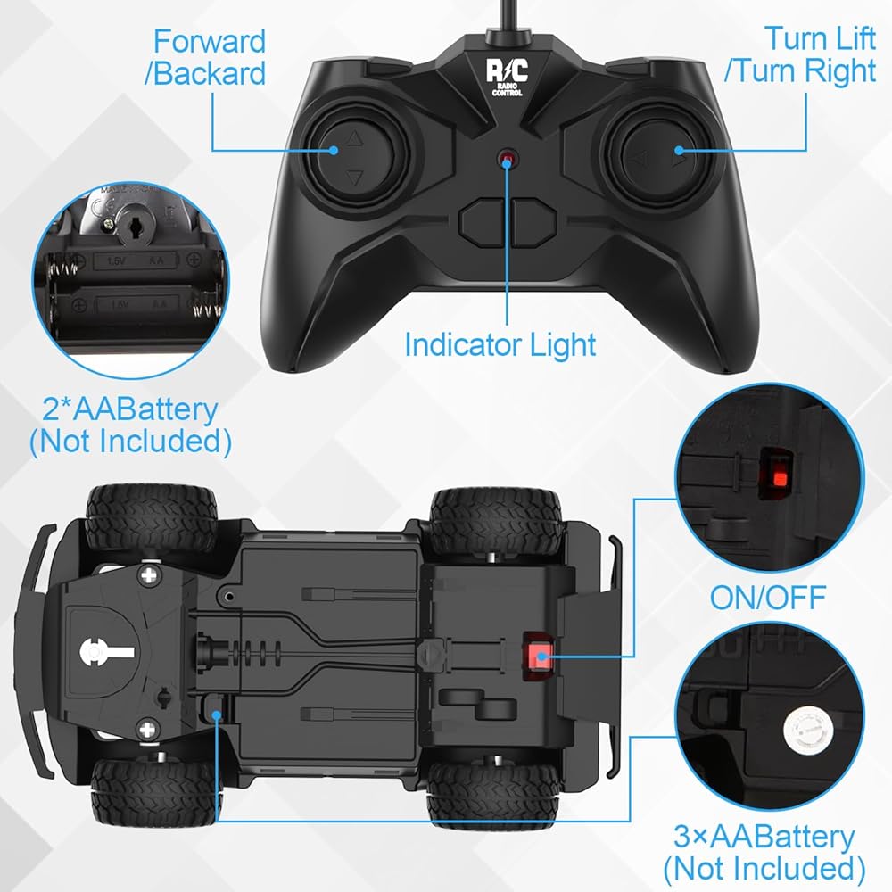 【حجم مثالي ومسافة تحكم】سيارة Rc بمقياس 1/24 مثالية للاستخدام الداخلي. (ملاحظة: بما أن السيارات لها نفس التردد، فسوف تتداخل مع بعضها البعض عندما تكون سيارتان أو أكثر قريبة من بعضها البعض.) تتطلب السيارة ثلاث بطاريات AA ويتطلب جهاز التحكم عن بعد بطاريتين AA (البطارية غير متضمنة).