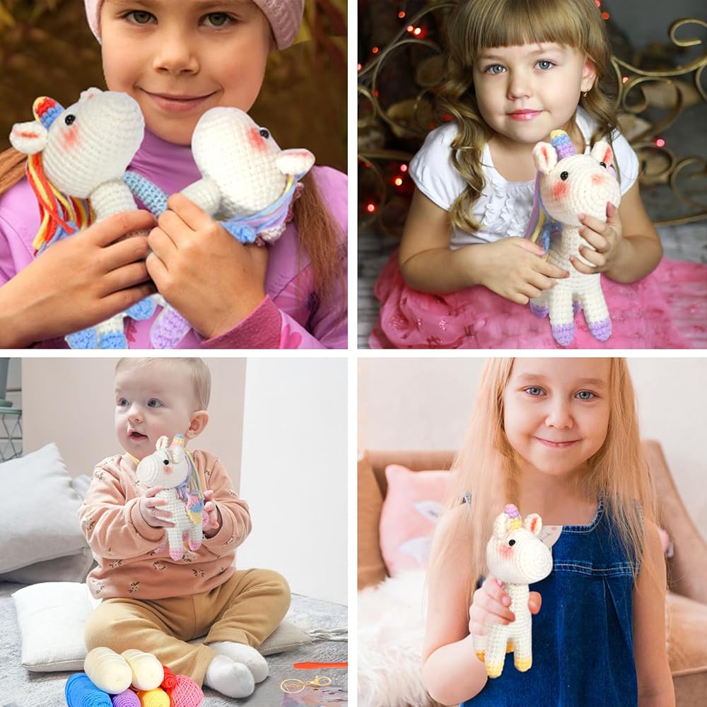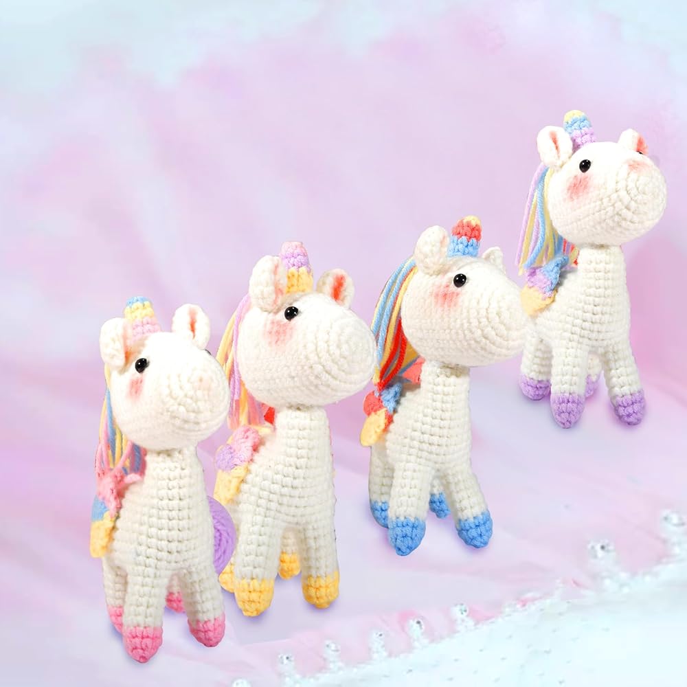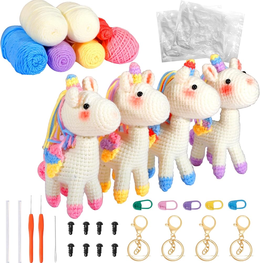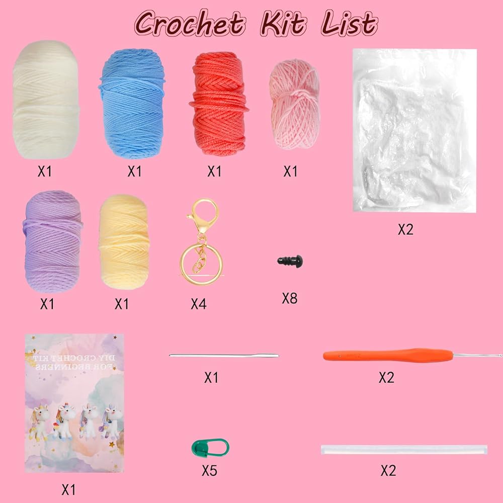 • All-In-One Crochet Starter Kit - Crochet kit for beginner includes everything you need to start, enough different colored yarns for making four crochet of unicorns, ample stuffing, 1 needle, 8 eyes, 5 stitch markers, 2 ergonomic crochet hooks, 4 keychains and a beginner's basic crochet manual.
