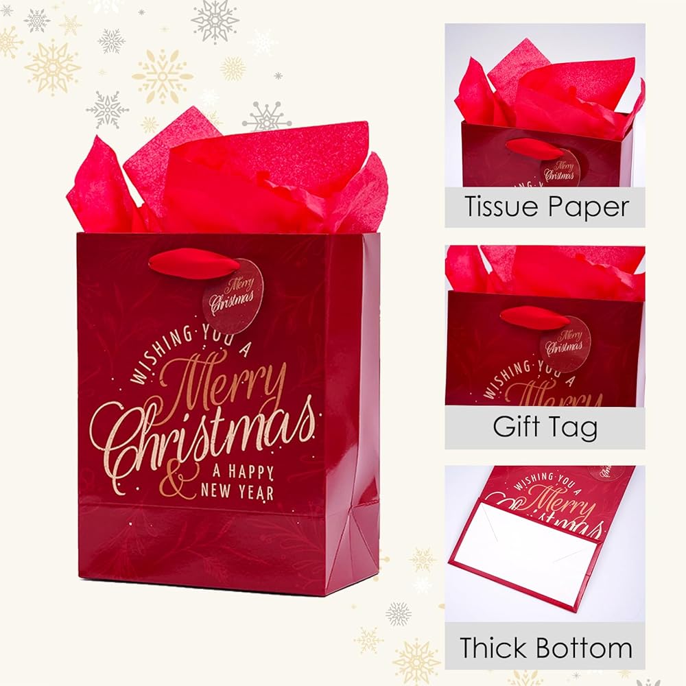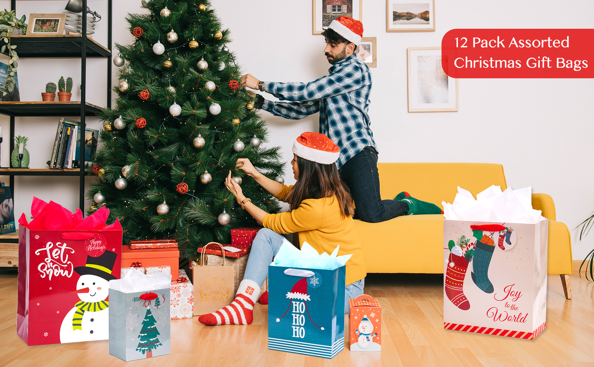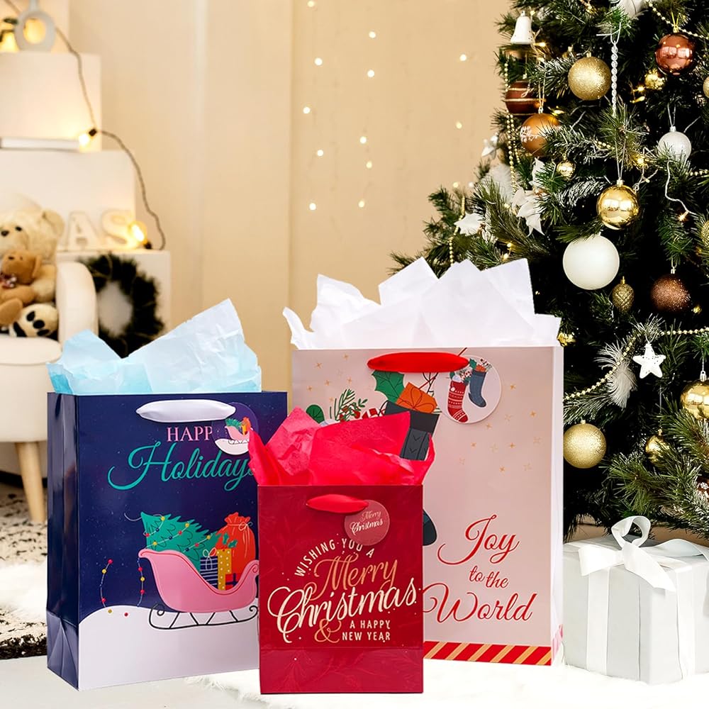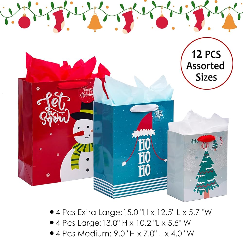 نيهوكني 12 عبوة من اكياس هدايا الكريسماس باحجام متنوعة مع مقابض، اكياس هدايا الكريسماس مع مناديل ورقية لهدايا العطلات والعائلة والحفلات المدرسية وغيرها (4 XL 15 انش، 4 L 13 انش، 4 M 9 انش)