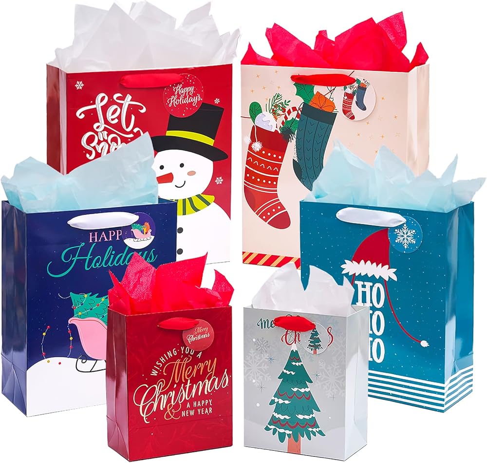 أظهر اهتمامك بأصدقائك أو عائلتك أو أقاربك مع أكياس هدايا الكريسماس القابلة لإعادة التدوير مع مناديل ورقية في موسم الأعياد هذا! مجموعة حقائب هدايا الكريسماس مثالية للمناسبات العائلية والكريسماس وحفلات العطلات الشتوية وأكثر من ذلك. اشترِ 12 حقيبة بثلاثة مقاسات، رائعة لتغليف مجموعة متنوعة من هدايا العطلات، من بطاقات الهدايا والكتب إلى الملابس والإلكترونيات. يمكن إعادة تدوير أكياس هدايا الكريسماس الفريدة هذه بالكامل، مما يجعلها طريقة مستدامة وصديقة للبيئة لتغليف الهدايا.
