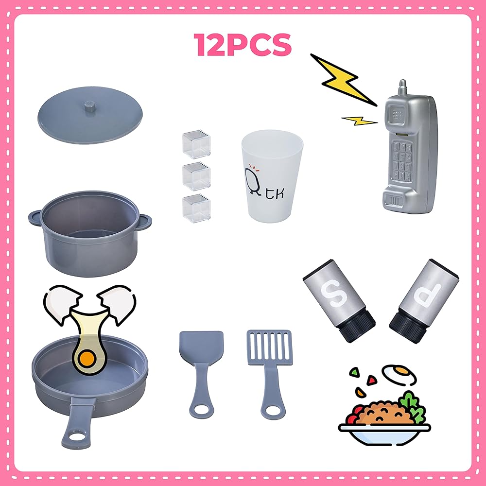 تشتمل على: مطبخ قائم بذاته بالإضافة إلى كوب، وثلاثة مكعبات ثلج، وهزازات توابل، ووعاء، وغطاء، ومقلاة، وملعقتين وهاتف متضمنة في مجموعة المطبخ الكاملة هذه.