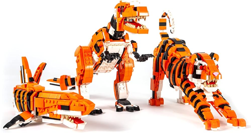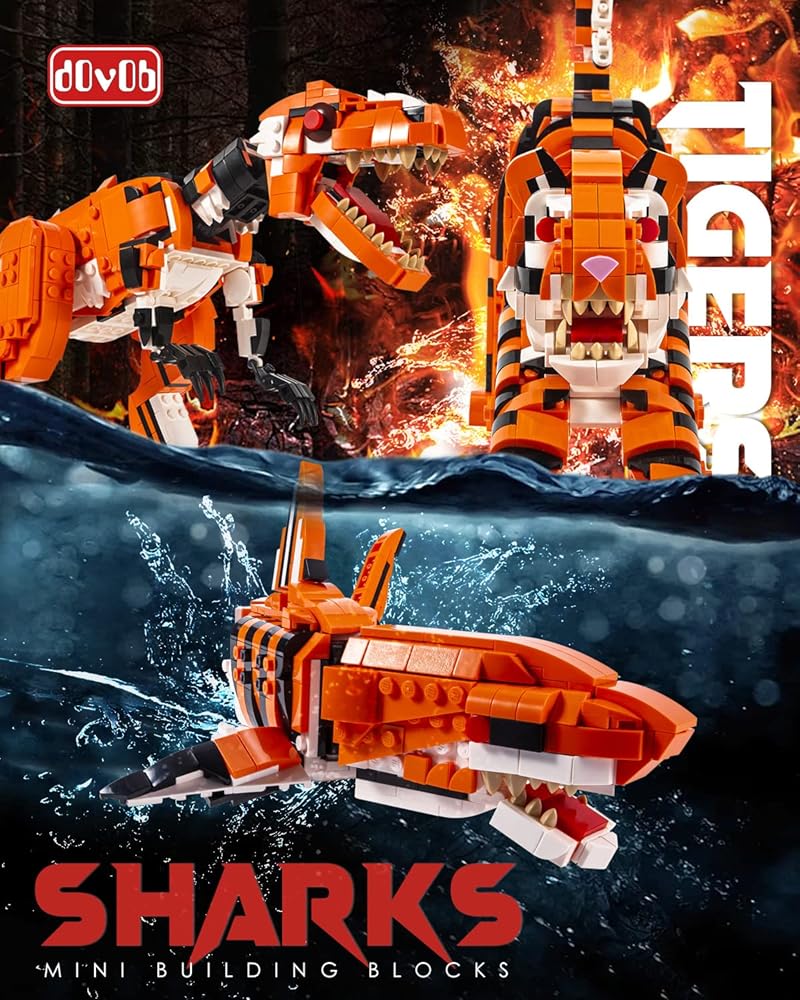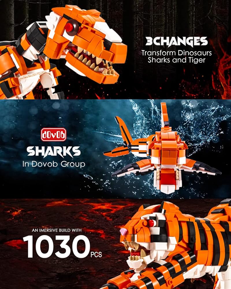 مجموعة مكعبات صغيرة 3 في 1 من dOvOb على شكل نمر أو تيرانوصور أو سمك القرش (1030 قطعة)، لعبة فكرة رائعة للأطفال والأولاد والبنات