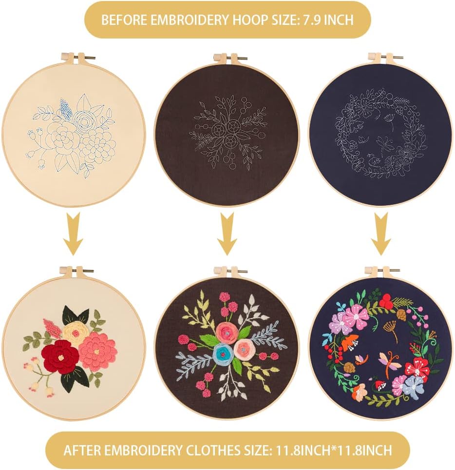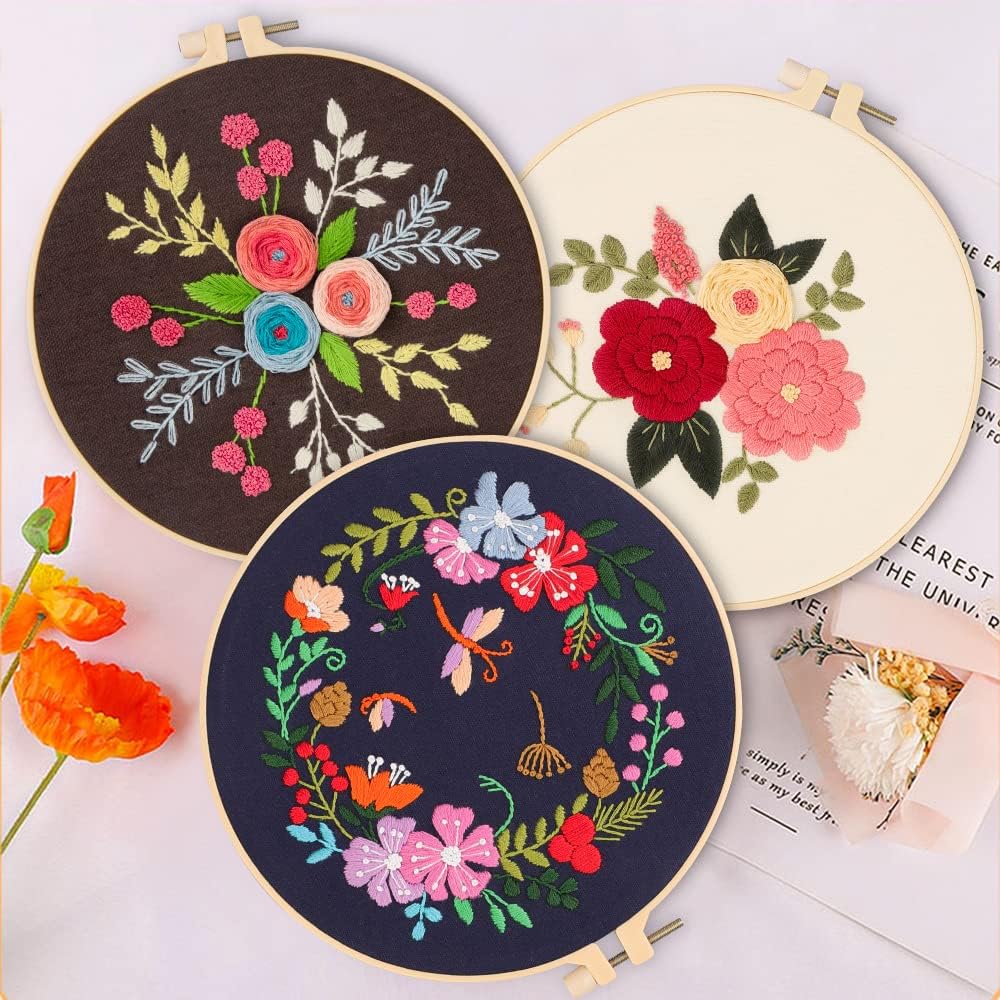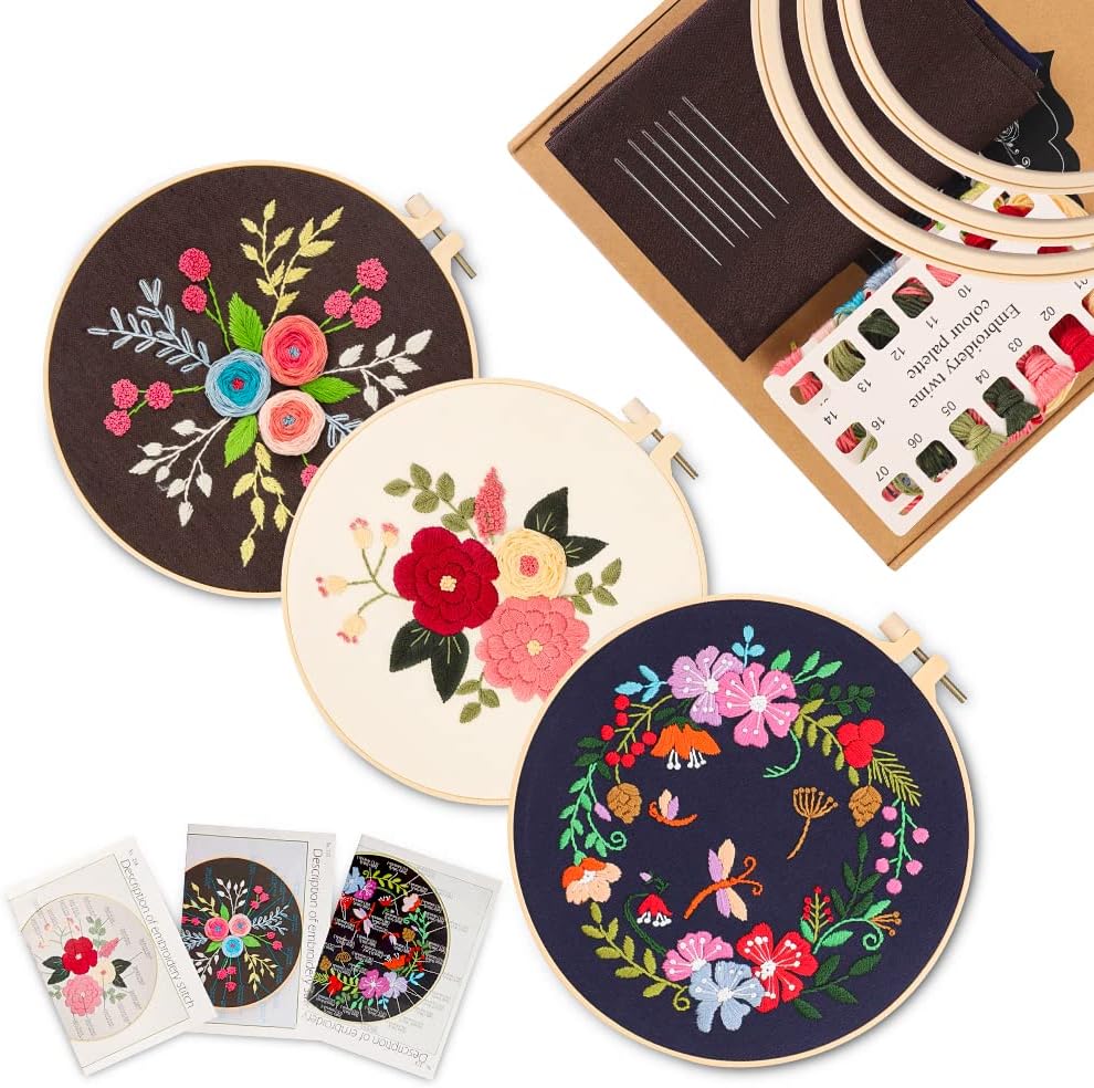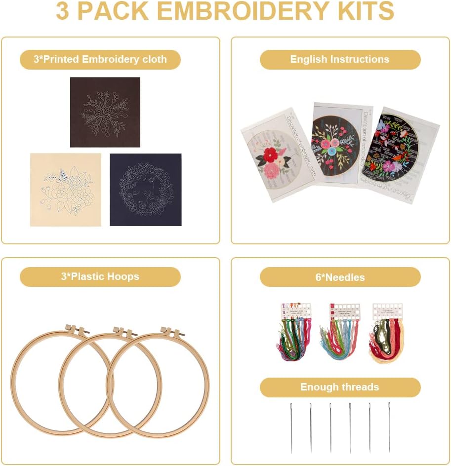【مجموعات التطريز الكل في واحد】مجموعة تطريز مكونة من 3 مجموعات للمبتدئين؛ تتضمن 9 × إبر، 3 × أطواق تطريز بلاستيكية، 3 × قماش مختوم، 3 × تعليمات باللغة الإنجليزية، 2 × أداة خيوط؛ 2 × وسادة مدبسة؛ 1 × قابلة للفك أيضًا؛ 1 × مقص وعدد كافي من الخيوط الملونة.