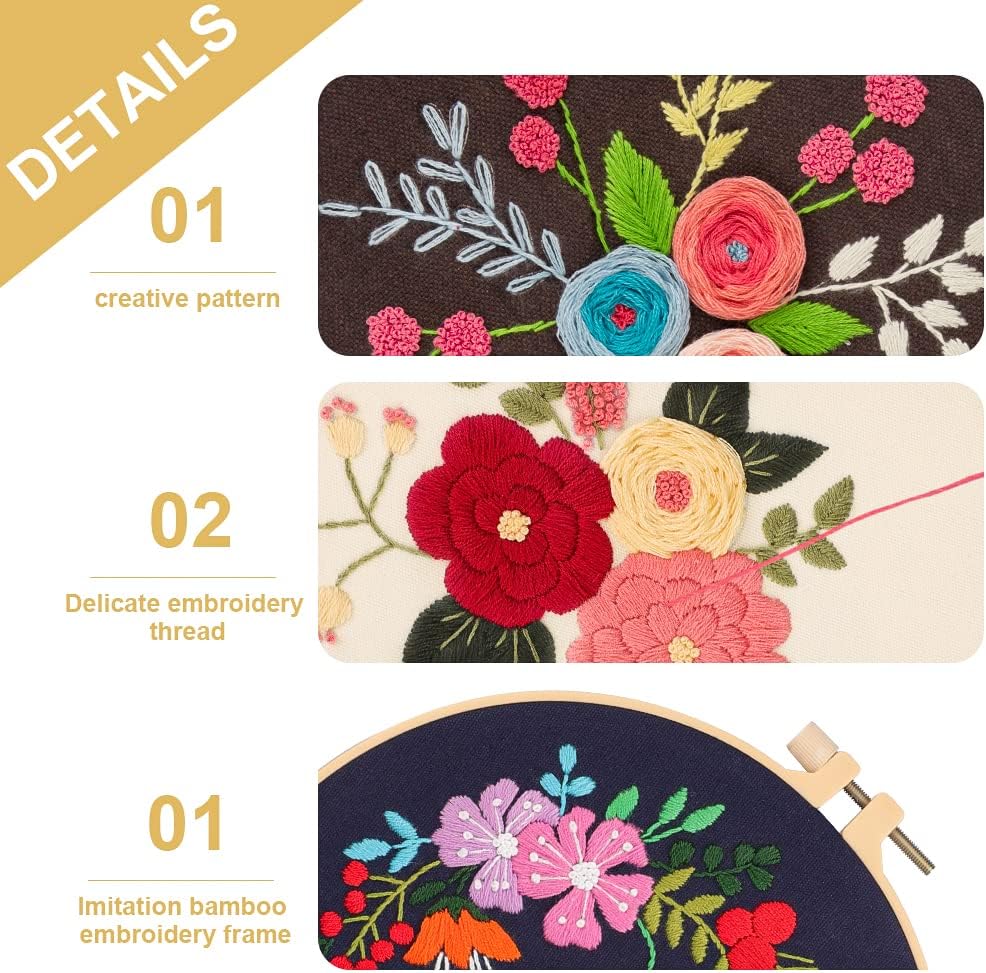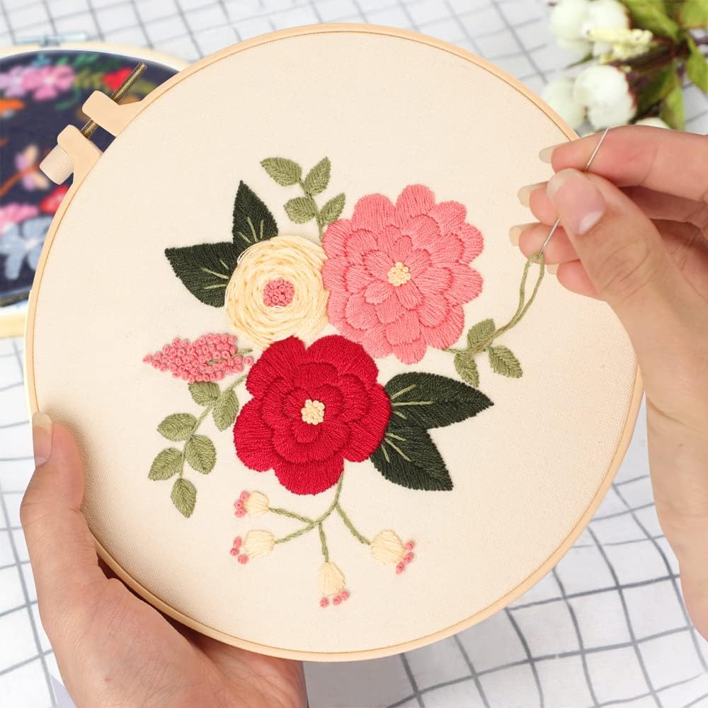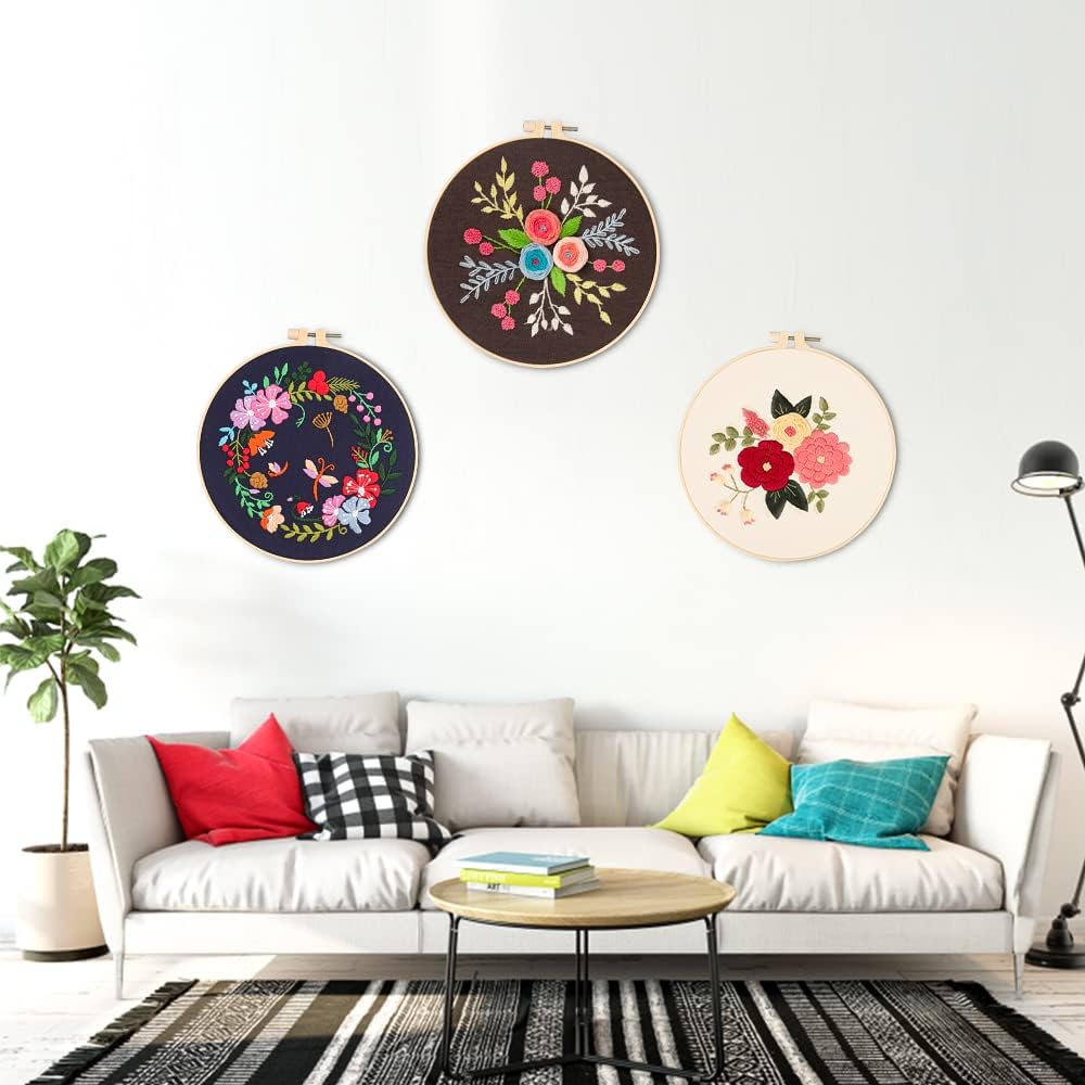 【مجموعات التطريز الكل في واحد】مجموعة تطريز مكونة من 3 مجموعات للمبتدئين؛ تتضمن 9 × إبر، 3 × أطواق تطريز بلاستيكية، 3 × قماش مختوم، 3 × تعليمات باللغة الإنجليزية، 2 × أداة خيوط؛ 2 × وسادة مدبسة؛ 1 × قابلة للفك أيضًا؛ 1 × مقص وعدد كافي من الخيوط الملونة.