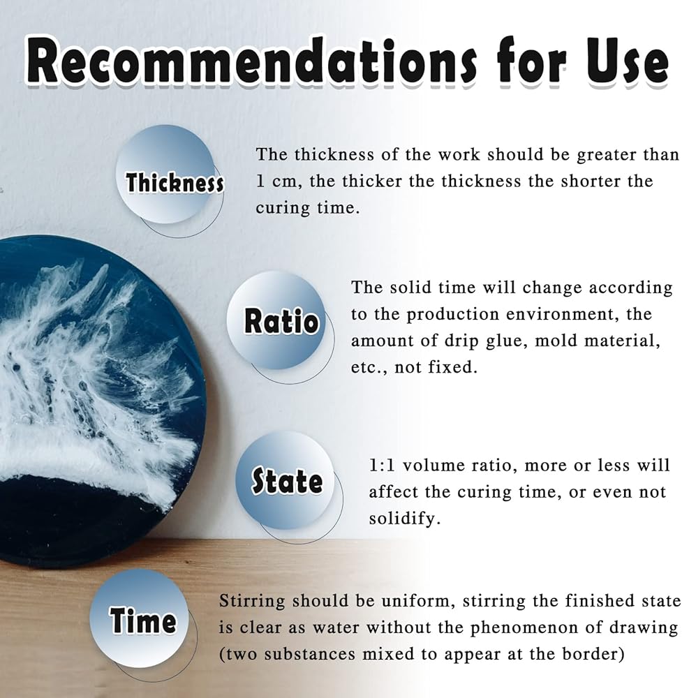 تطبيقات متعددة: يمكن استخدام راتنجات الايبوكسي لدينا في مجموعة متنوعة من المشاريع الفنية التي تصنعها بنفسك، وصناعة المجوهرات، وطلاءات سطح المكتب، وإبداعات القوالب. إنه مثالي للأكواب وأسطح العمل والحرف اليدوية والرسم والمنتجات الخشبية. نحن ندعم منتجاتنا ونقدم خدمة عملاء ممتازة. إذا كان لديك أي أسئلة أو استفسارات، يرجى الاتصال بنا وسنكون سعداء بمساعدتك.