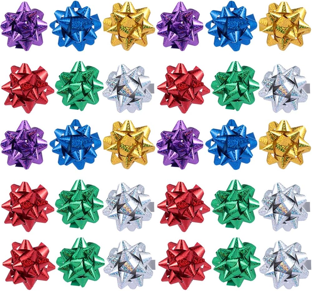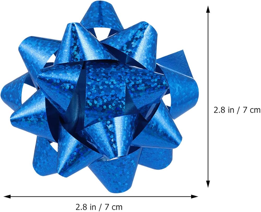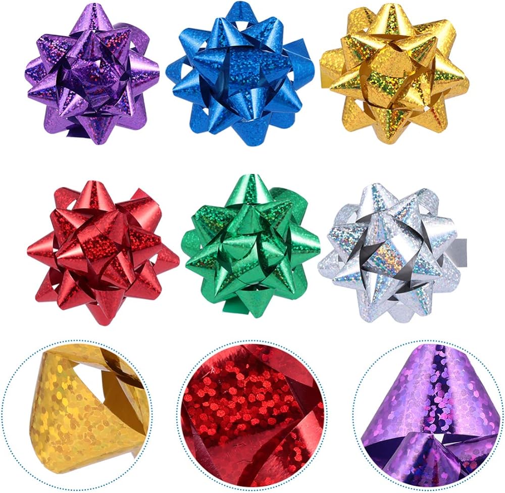 Packaged Including: You will get 100pcs gift wraping bows in a total of 6 colors - gold, silver, green, purple, blue and yellow. Size is 8 x 7 x 3cm/ 3.14 x 2.75 x 1.18in. Enough quantity to meet your needs. Perfect for gift box packaging.