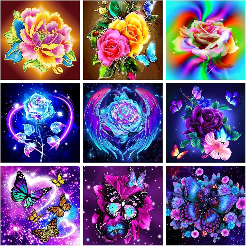 فاين جير باو 9 عبوات من مجموعات الرسم الماسي 5 دي للبالغين، فن ماسي يدوي للبالغين، فن كريستال مثقوب بالكامل لتزيين جدار المنزل، 11.8 انش × 11.8 انش (زهور)