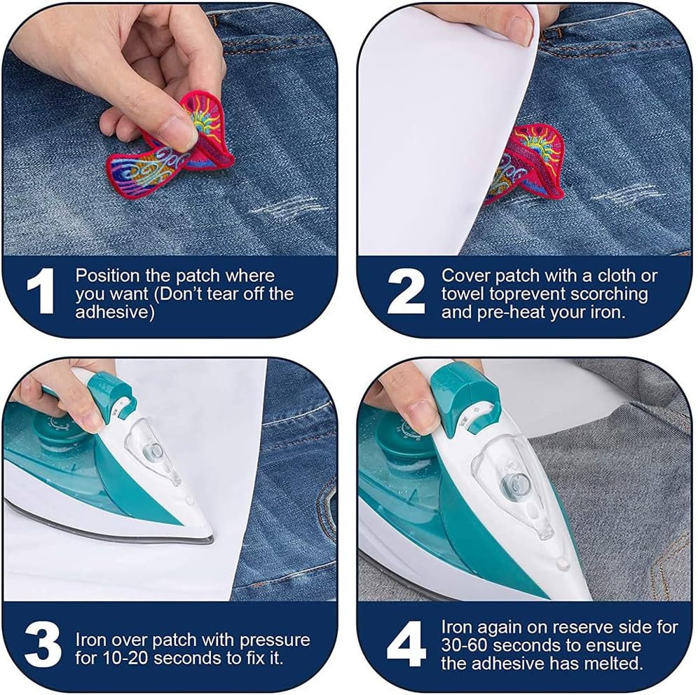 تعليمات الكي - رش الماء على الجزء الخلفي من رقعة KORAJOY؛ ضع الرقعة على الملابس؛ ضبط درجة حرارة المكواة على "القطن"؛ تغطية الرقعة بقطعة قماش مبللة. قم بالكي لمدة 30 إلى 40 ثانية؛ اقلب الملابس من الداخل إلى الخارج ثم قم بكيها حتى تجف.