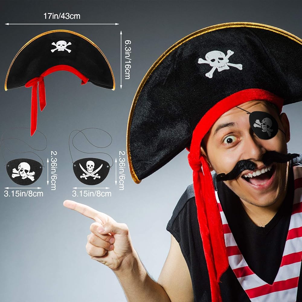 مجموعة قبعات القراصنة التنكرية هذه مصنوعة من مواد عالية الجودة لارتداء مريح. تصميم القراصنة الكلاسيكي يجعلك تشعر ببراءة القراصنة ووحشيتهم وتستمتع في الحفلات التنكرية.