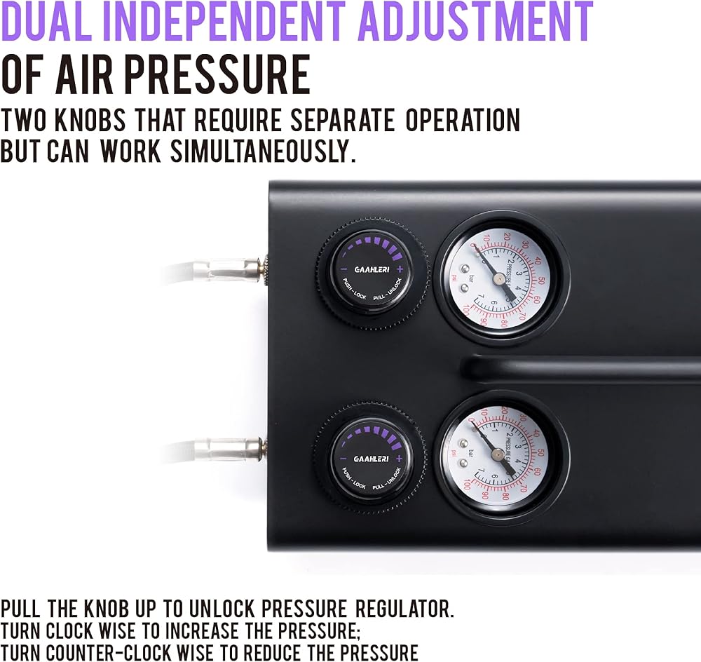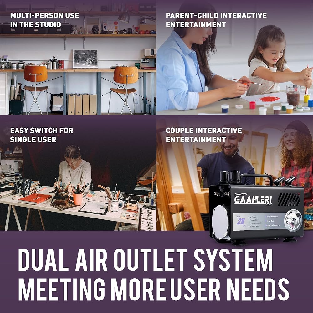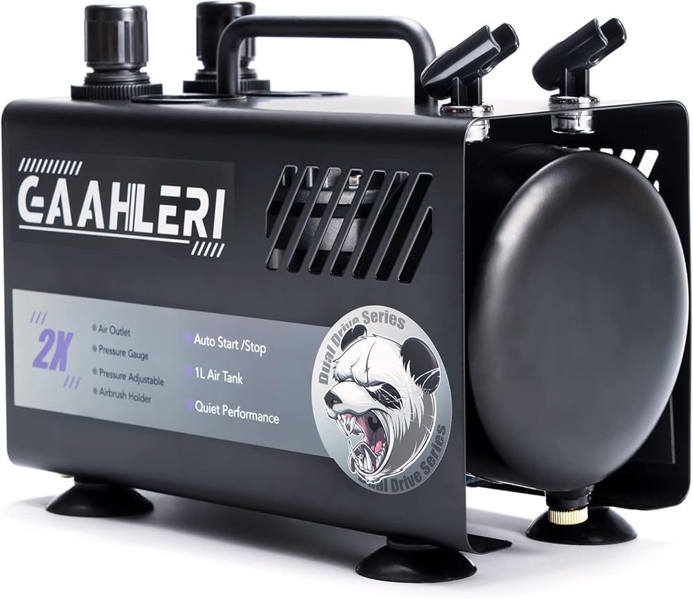[تدفق هواء متسق وخزان هواء مدمج] تتميز مجموعة فرشاة الهواء الاحترافية ثنائية المحرك من Gaahleri بخزان هواء مدمج سعة 1 لتر يعزز اتساق تدفق الهواء، ويمكنك الاستمتاع بتشغيل سلس دون شراء مكونات إضافية.