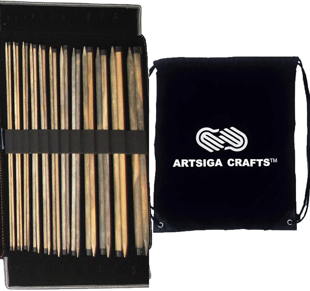 الحزمة: مجموعة إبر الحياكة LYKKE المستقيمة من خشب Driftwood بطول 14 بوصة (35.5 سم) من قماش الدنيم الأسود مع حقيبة مشروع Artsiga Crafts