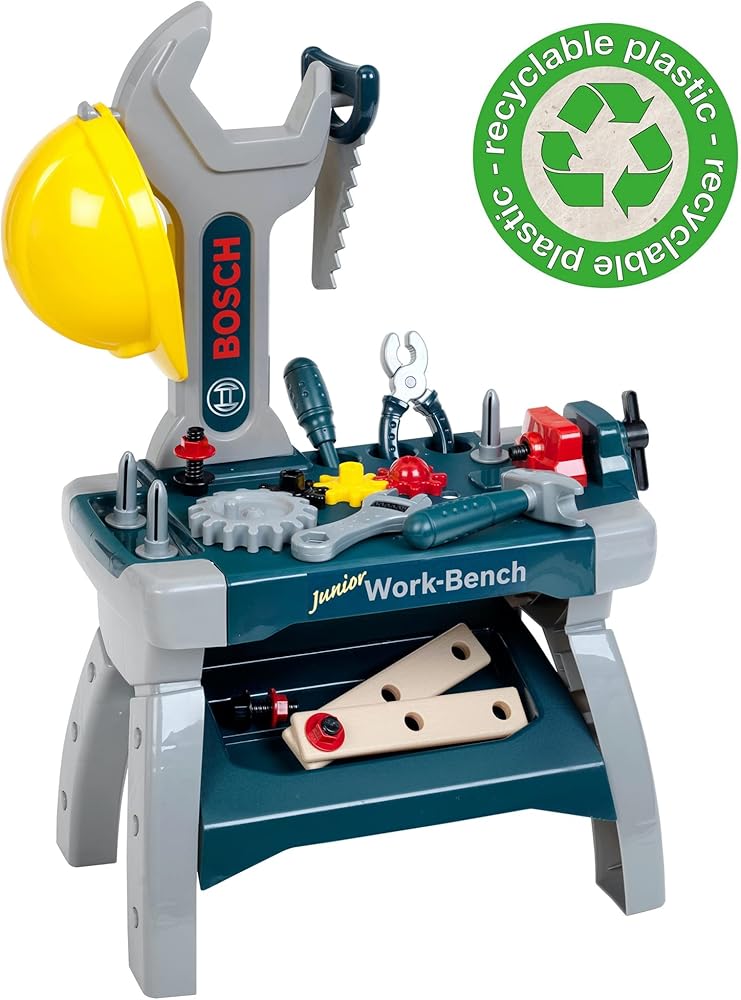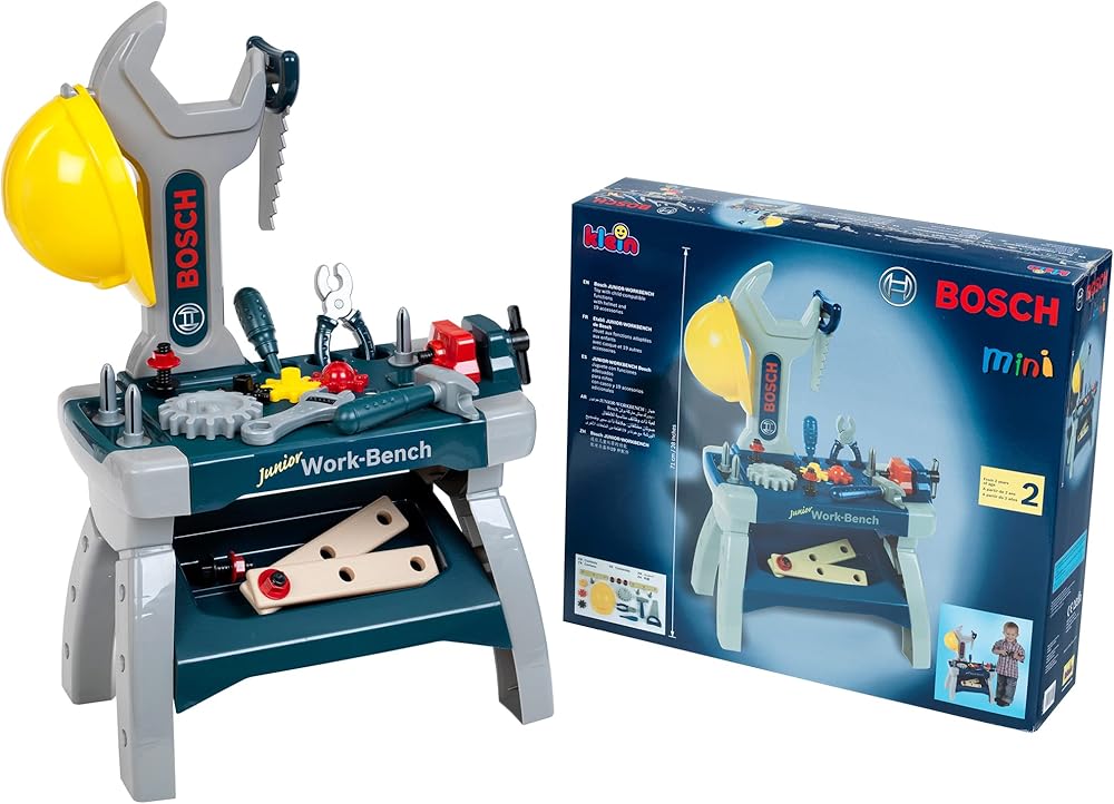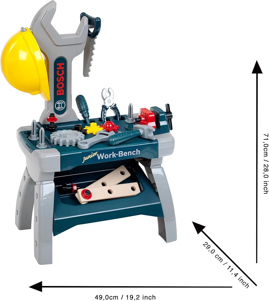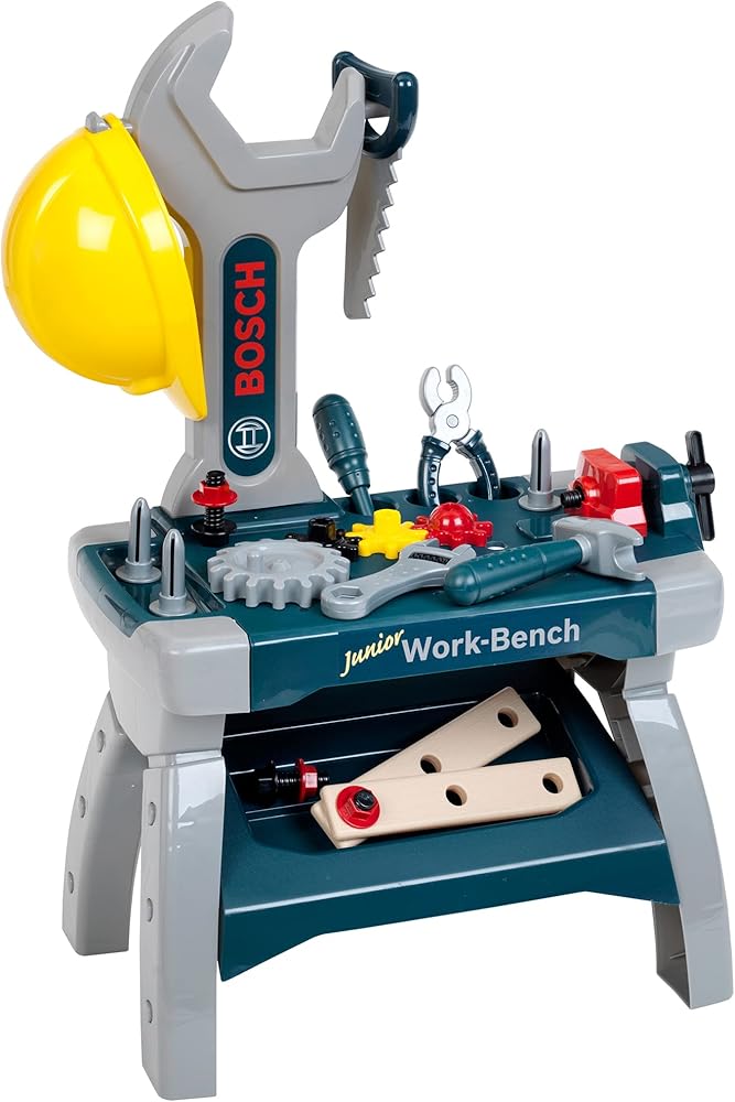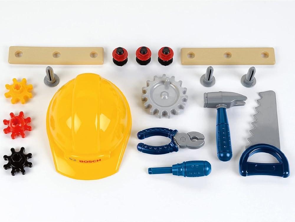 • تتضمن - طاولة عمل صغيرة مع منشار ومطرقة وكماشة وملزمة عمل ومفك براغي يدوي وقبعة صلبة وصواميل ومسامير وتروس ومفك براغي متنوعة