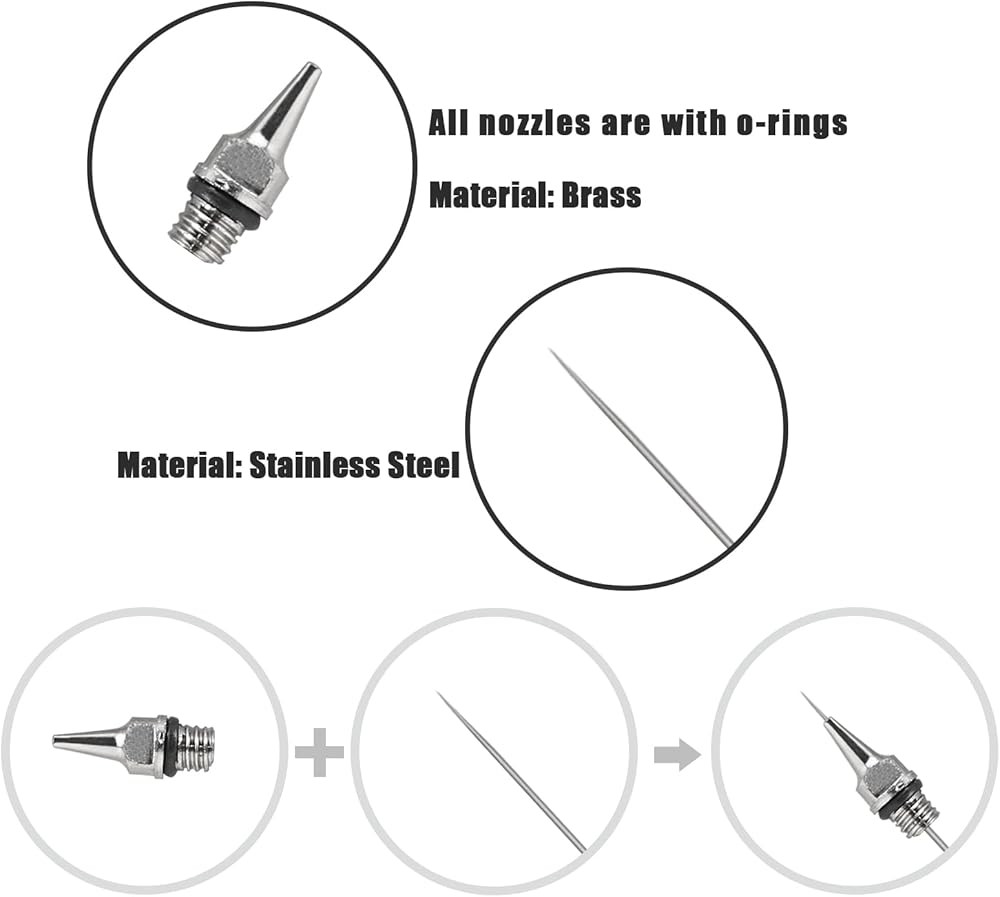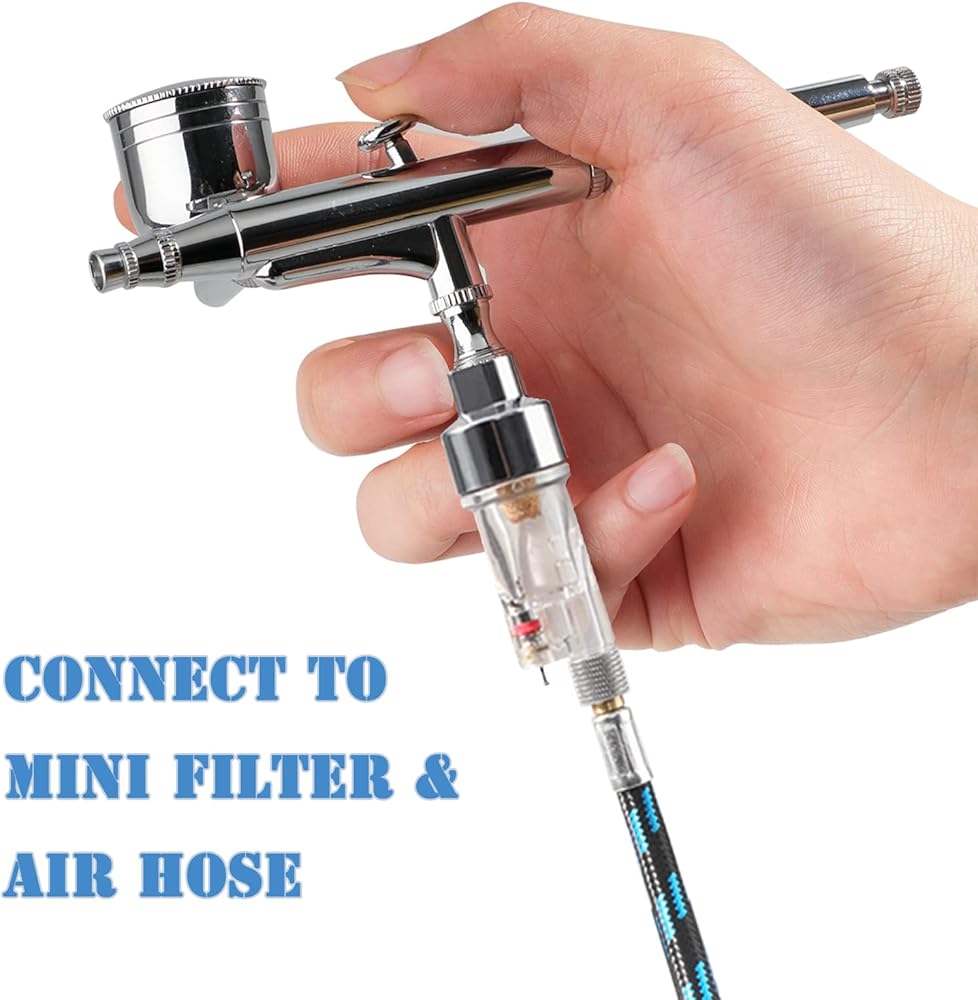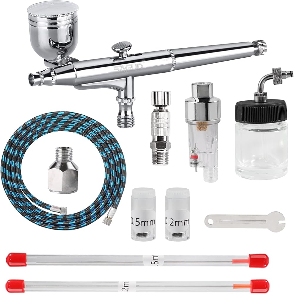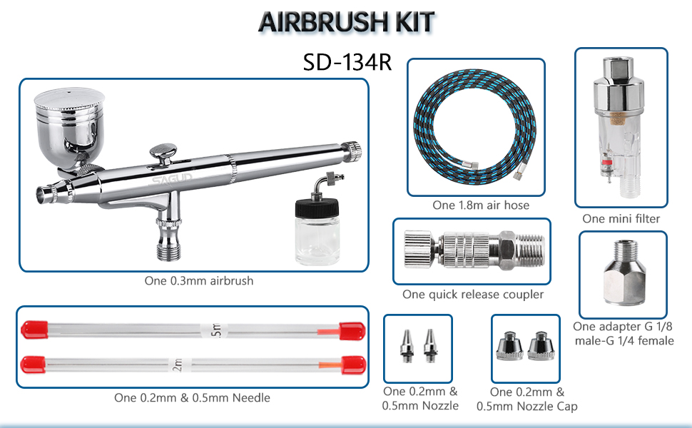 تتضمن مجموعة البخاخة قطعة واحدة من مسدس فرشاة الهواء 0.3 ملم، قطعة واحدة من غطاء الفوهة 0.2 ملم، قطعة واحدة من غطاء فوهة السائل 0.5 ملم وإبرة، قطعة واحدة من خرطوم الهواء المطاطي المضفر 1.8 متر (6 قدم)، قطعة واحدة من المحول، قطعة واحدة من فلتر الفرشاة الهوائية الصغير