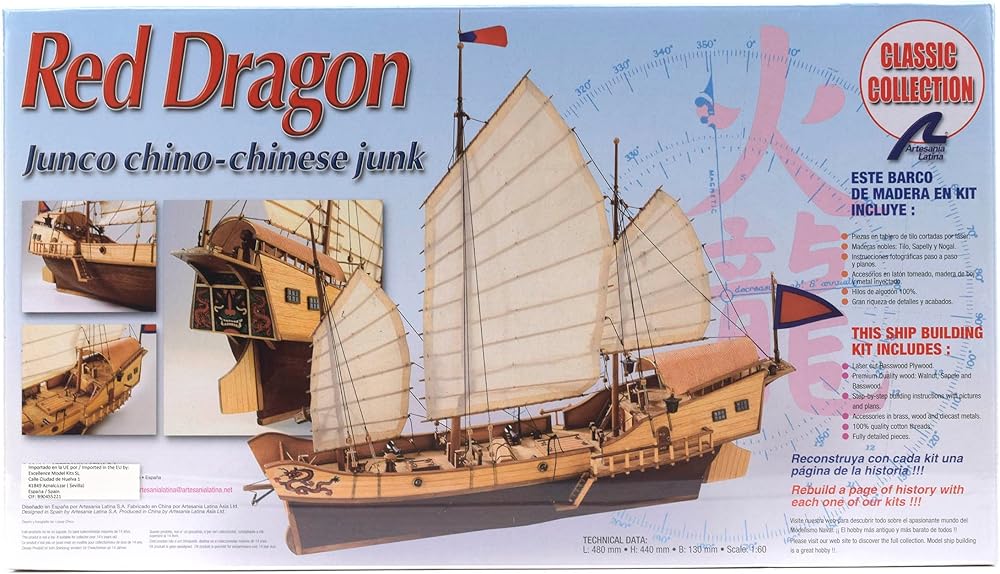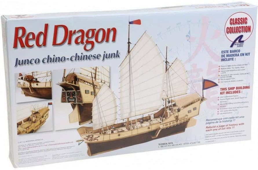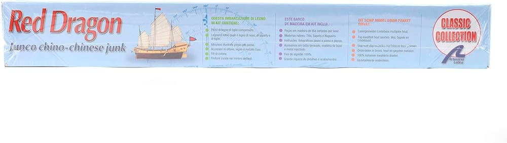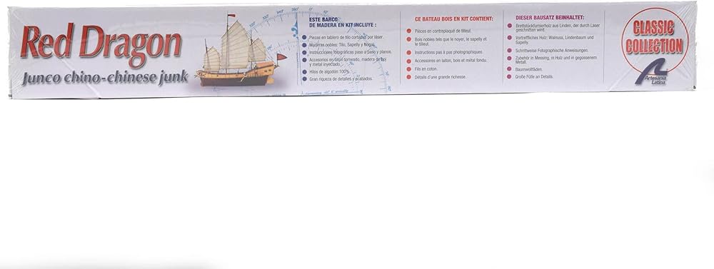 Red Dragon Reed Naval Modelling Kit. Build the wooden model of the Chinese boat and add an exotic touch to your modeler collection. With the purchase of the kit, you will have all the necessary pieces to complete the 1/60 scale model of the boat: wood and metal, threads, fabric for the sails... enjoy with a boat that has more than two thousand six hundred years of history. Discover the Red Dragon model in this Chinese junk wood. Still in use in many parts of Southeast Asia, these boats were used for war and for trade. The appearance of the tongues is about 600 B.C. The hull has no keel and a short tail; sails are thick fabric reinforced with reeds that gives a lot of stability and push. It was one of the ships most commonly used for piracy off the coast of Southeast Asia. Modelling kit contents Red Dragon build your 1/60th scale model of the red dragon, a Chinese junk. Your build system via your model for the construction of the actual ship assembly. The kit contains modelling plate pieces laser cut precision, hardwoods, brass, cast iron and fabric. For assembly, you can follow our complete step by step instructions in 4 languages and full colour, accompanied by full-scale drawings of the finished model.