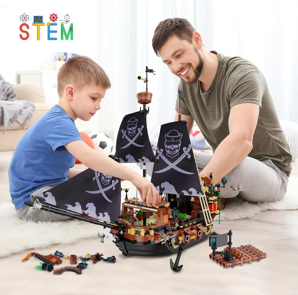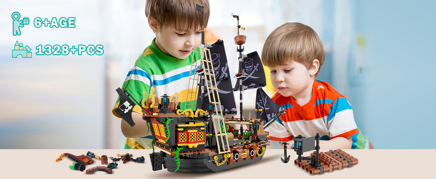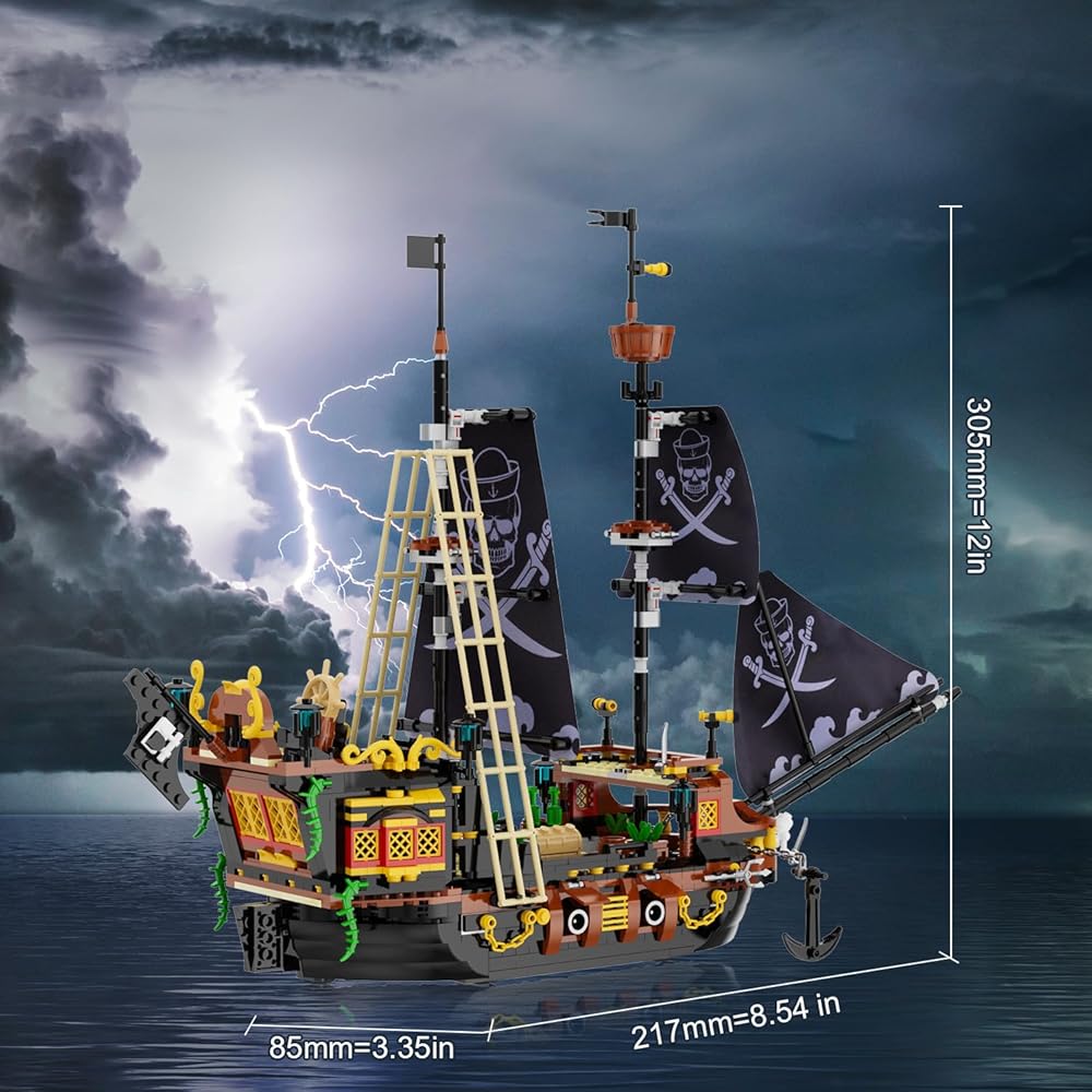 Learn while playing - This pirate ship toy for children is 12 inches long, 8.54 inches high and 3.34 inches wide. This pirate ship kit helps promote children's creativity and curiosity, improve their imagination and spatial thinking. With the help of the enclosed illustrated instructions (English language not guaranteed), children can easily assemble a complete pirate ship