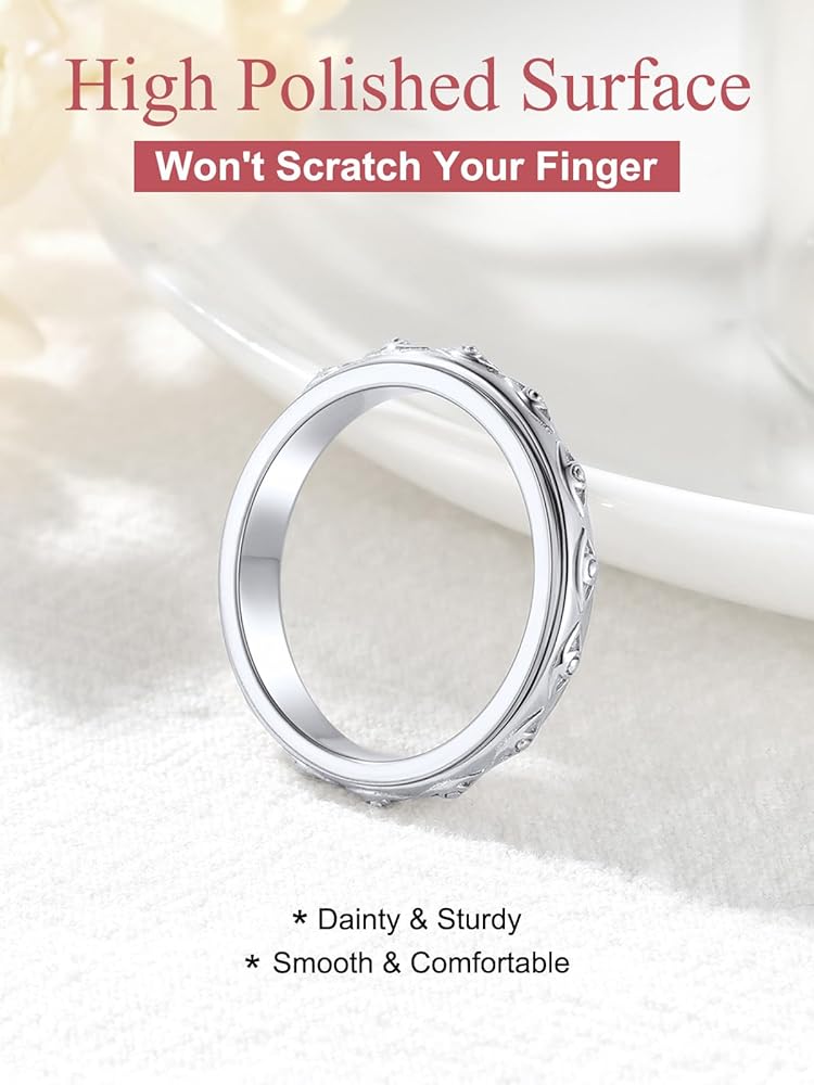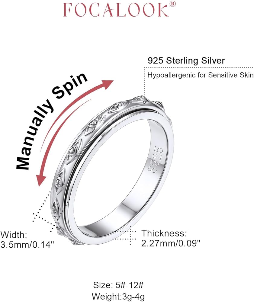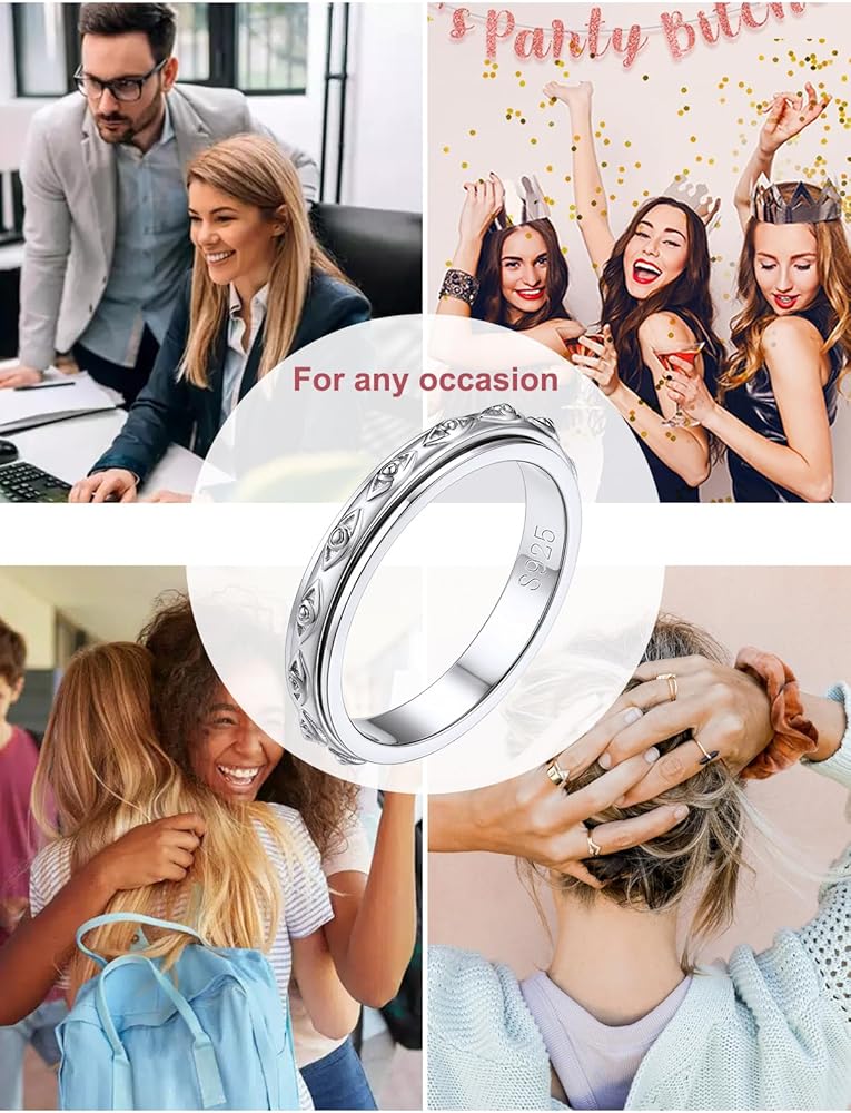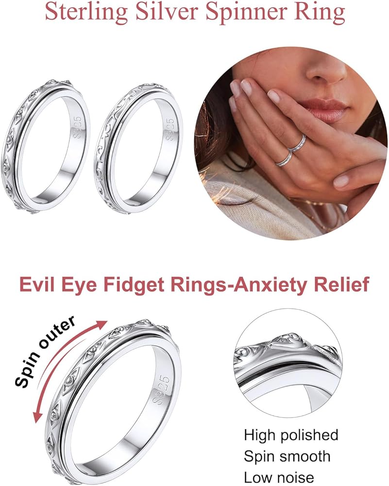 تصميم بسيط: هذه الحلقة المضادة للقلق هي حلقة بسيطة ولكنها لافتة للنظر من الفضة النقية مع تصميم عين شريرة منقوشة على الشريط الخارجي. يدور الشريط الخارجي وينزلق بحرية على الحلقة الناعمة والرقيقة، ليُظهر سحر نمط عين الشر، الذي يُعتقد أنه يحمي من الطاقة السلبية. احتضن قوة الإيجابية وارتدي هذا الإكسسوار العصري والعملي للابتعاد عن القلق.