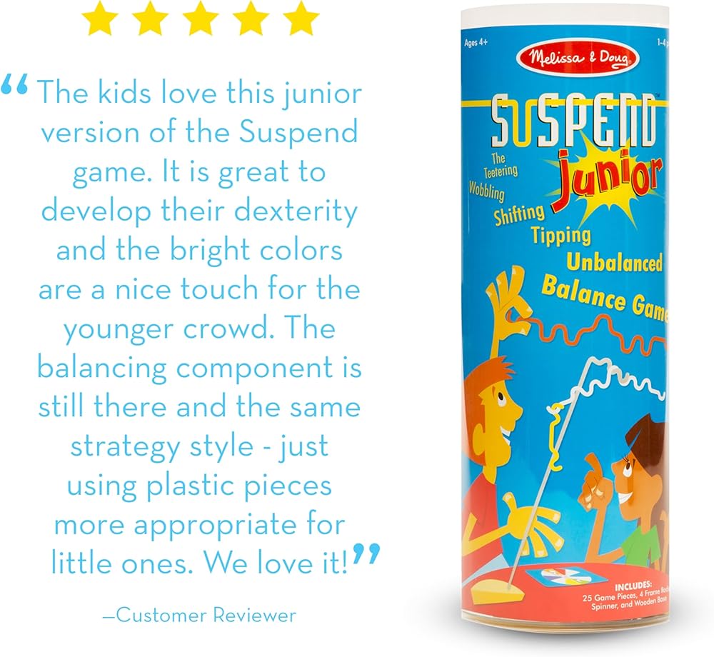 بناءً على النجاح الهائل الذي حققته ساسبند، فإن إصدار جونيور الجديد يجلب لعبة التوازن الرائجة هذه للأطفال الأصغر سنًا بألوان أكثر إشراقًا وقطع أخف وزناً ودوار جديد تمامًا. اللعب سهل: ببساطة قم بإعداد الإطار وتدوير الدوار وموازنة القطع المرمزة بالألوان لإنشاء هيكل تعليق مذهل. تسابق ضد خصومك لتكون أول من ينفد من القطع - ولكن احترس: حركة خاطئة واحدة ويمكن أن يسقط الهيكل بأكمله! هذه اللعبة المثيرة مثالية للاعبين الصغار - لا توجد حاجة للقراءة، وتنمو مهارات النجاح مع كل لعبة. يتعلم الأطفال كيفية التوازن والتوازن، وتحمل المخاطر الذكية، والتنبؤ بالعواقب، كل ذلك مع الاستمتاع بالكثير من المرح! مناسبة لـ 1-4 لاعبين. يوصي أطباء الأطفال بالألعاب التي تشجع على التفاعل والتجارب اللغوية الغنية. لعب الألعاب مثل سوسبند جونيور يعزز التفكير النقدي والمهارات الاجتماعية. هذه اللعبة تمثل هدية رائعة للأطفال من سن 4 سنوات إلى 12 سنة، وسيحب المراهقون والكبار من جميع الأعمار اللعب بها. أضف مليسا اند دوغ Tic-Stac-Toe لإكمال تجربة اللعب ومنح الأطفال خيارًا جذابًا آخر للاستمتاع بدون شاشة. لأكثر من 30 عامًا، ابتكرت مليسا اند دوغ منتجات مصممة بشكل جميل تحفز الخيال والإبداع أطلقت عليها NBC News اسم "المعيار الذهبي في اللعب في مرحلة الطفولة المبكرة". نصمم كل لعبة وفقًا لأعلى معايير الجودة، ولرعاية العقول والقلوب. إذا لم يكن طفلك مصدر إلهام، فاتصل بنا وسنقوم بتصحيح الأمر. رقم هاتفنا موجود على كل منتج!