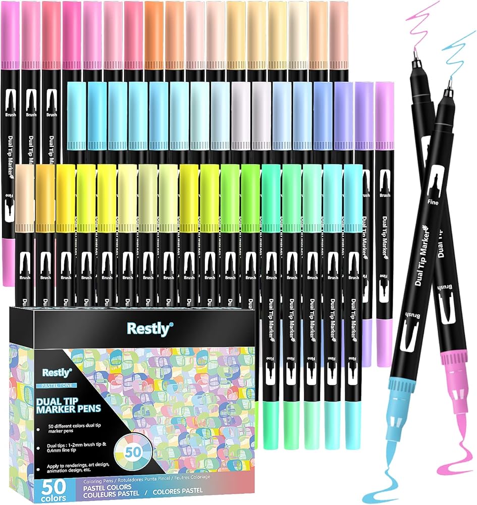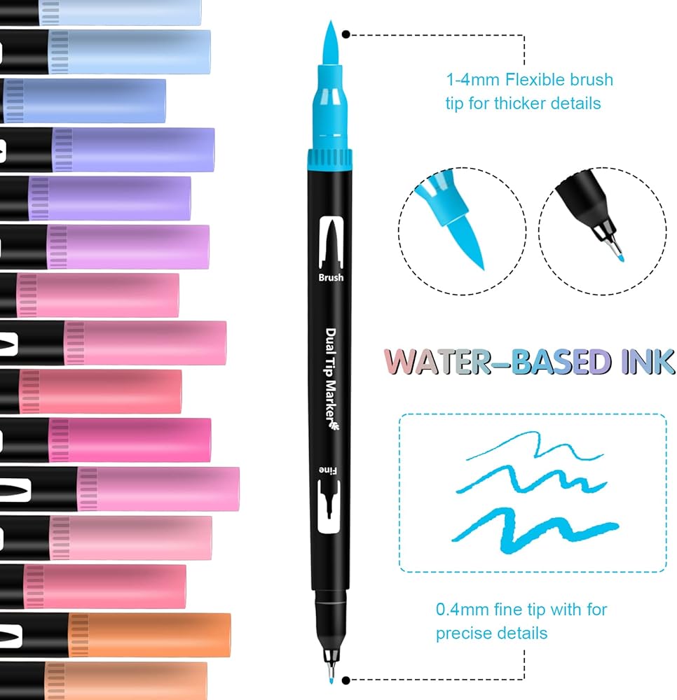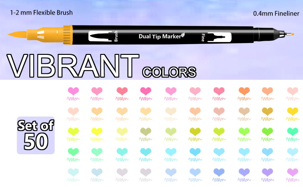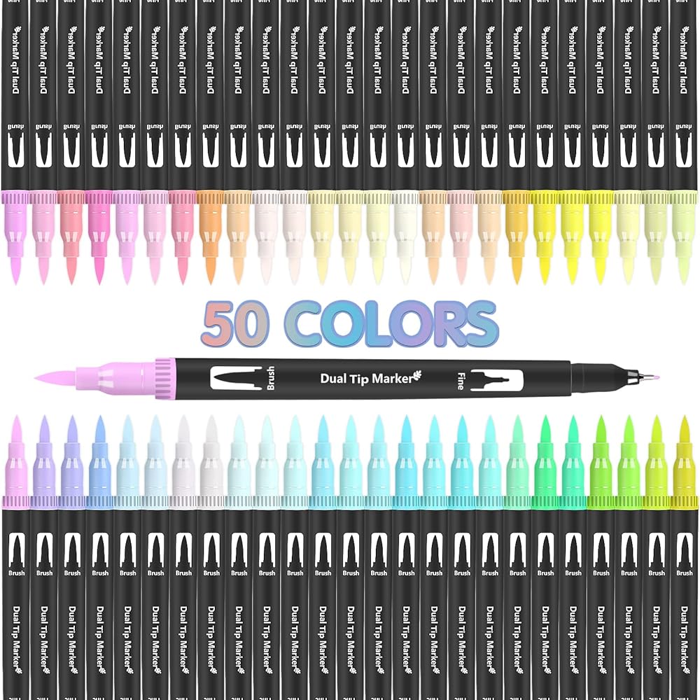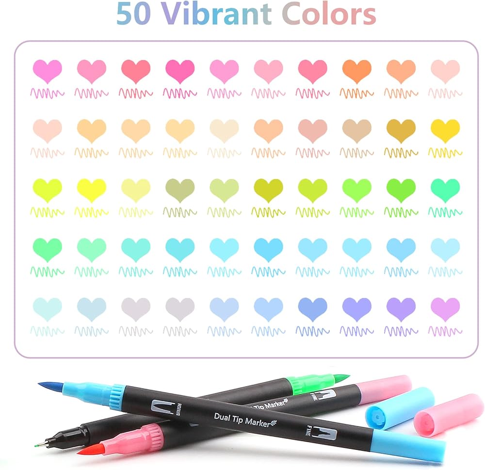 جودة عالية: 50 قلم تحديد برأس مزدوج مع تقنية ال ان كيه ذات أساس مائي. تستخدم أقلام الفرشاة ألوانًا انسيابية بدون تسريب وسريعة الجفاف ونابضة بالحياة وهي مثالية لكتب التلوين وصنع البطاقات والحرف اليدوية والتصميم والمشاريع الفنية والحروف اليدوية.