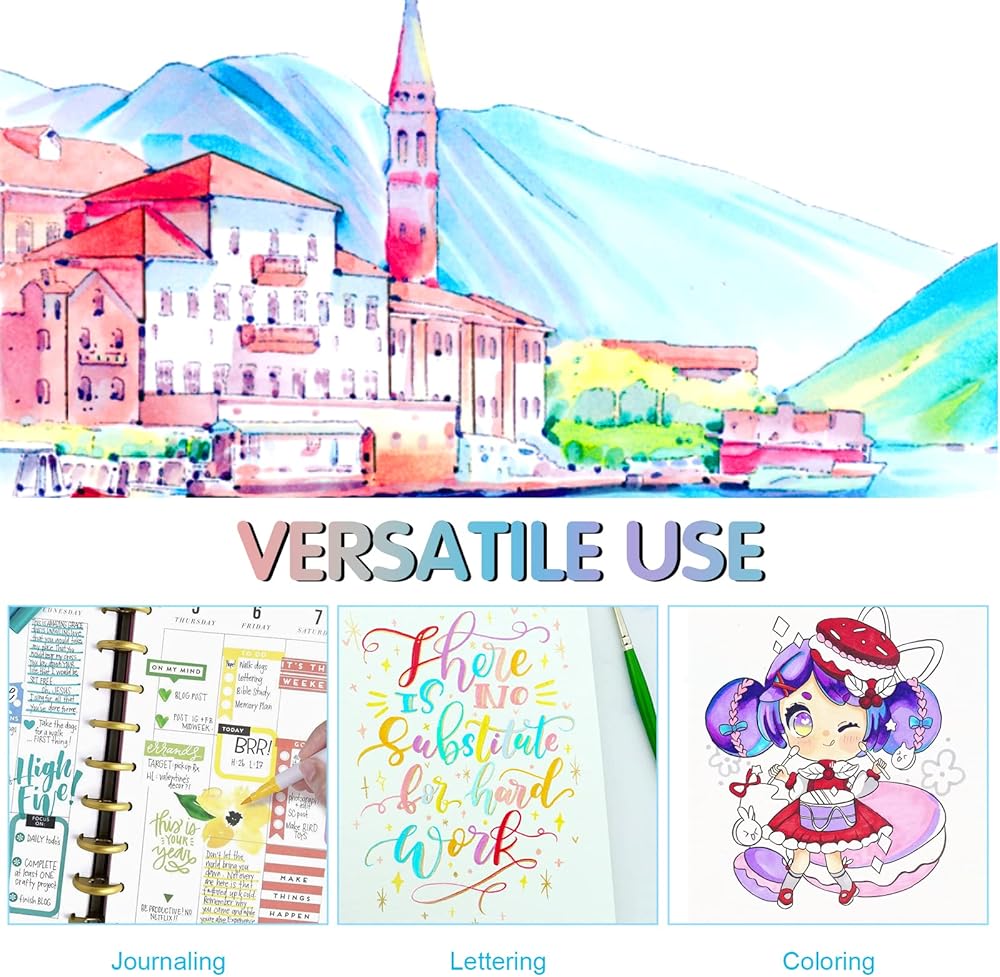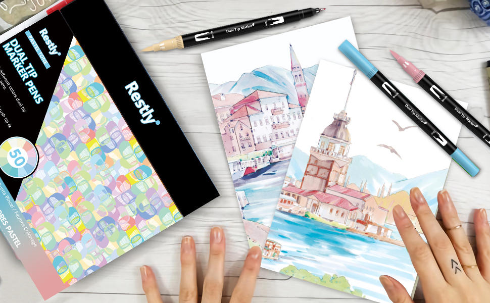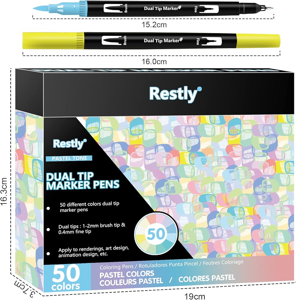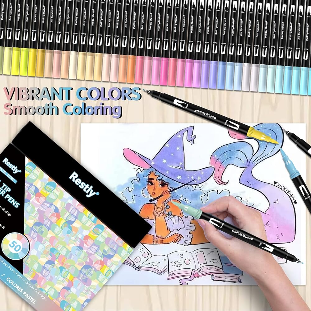 جودة عالية: 50 قلم تحديد برأس مزدوج مع تقنية ال ان كيه ذات أساس مائي. تستخدم أقلام الفرشاة ألوانًا انسيابية بدون تسريب وسريعة الجفاف ونابضة بالحياة وهي مثالية لكتب التلوين وصنع البطاقات والحرف اليدوية والتصميم والمشاريع الفنية والحروف اليدوية.
