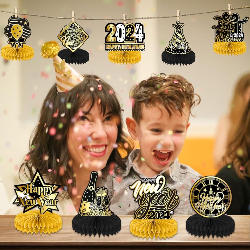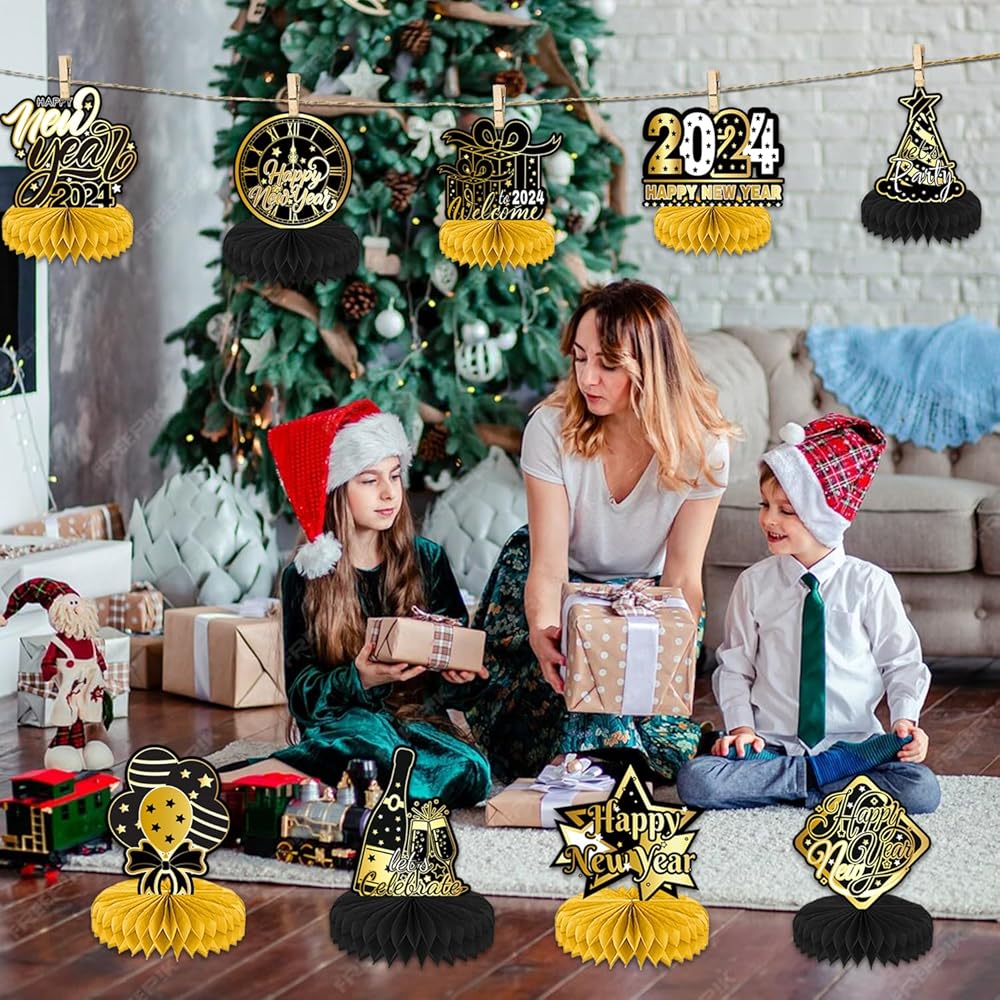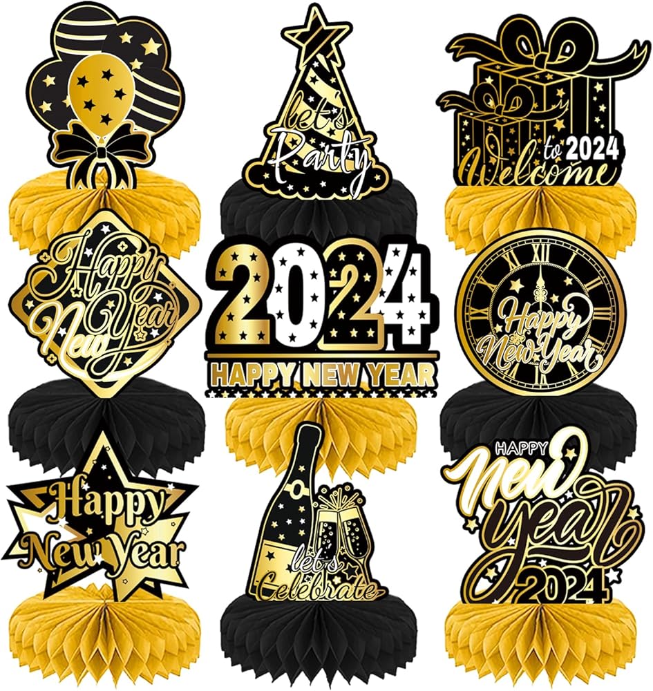 9 قطع 2024 ديكور طاولة حفلات رأس السنة الجديدة، قطع مركزية على شكل قرص العسل لرأس السنة الجديدة، قطع مركزية ثلاثية الأبعاد لطاولات رأس السنة الجديدة، قطع مركزية على شكل قرص العسل لمستلزمات حفلات رأس السنة الجديدة