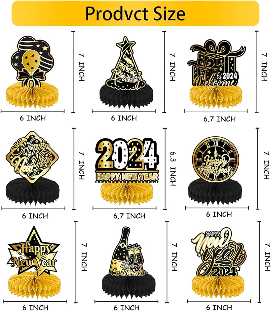 Package Contents: You will receive 9 pcs Happy New Year party supplies honeycomb decorations with different patterns for NYE New Years Eve party centerpieces, and the size of each centerpiece is about 6.5 inches. All of them are double-sided and made of thick high-quality cardstock and paper, non-toxic, no fade and durable