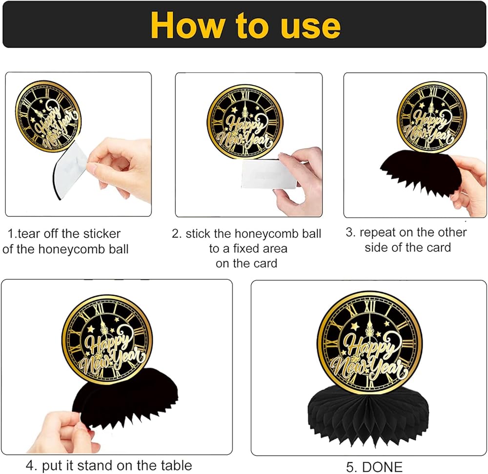 Easy to Assemble: Peel off the sticker of the honeycomb ball, stick the honeycomb ball on the fixed area of the card, repeat it on the other side of the card, and finally stand it on the table. These New Year Party honeycomb decorations table centerpieces in just a few seconds, saving time and effort