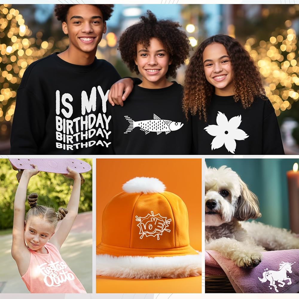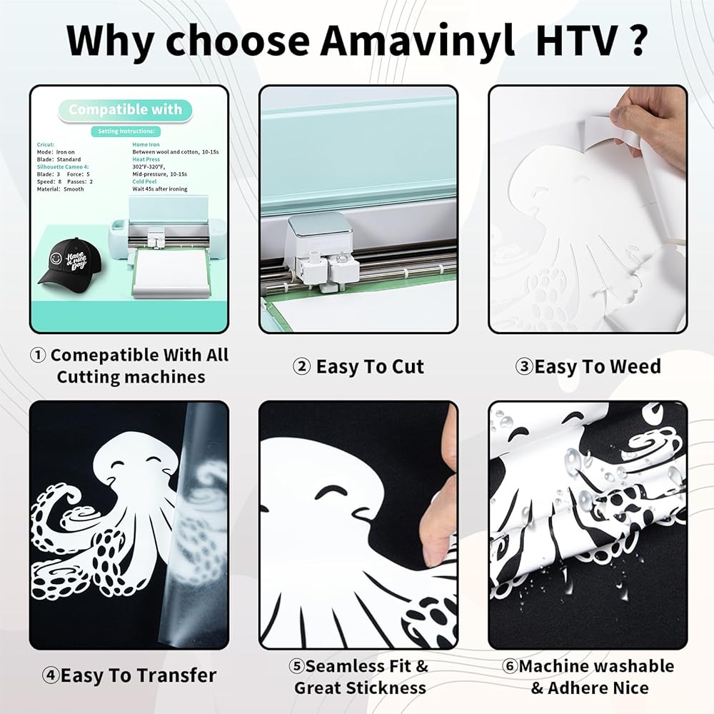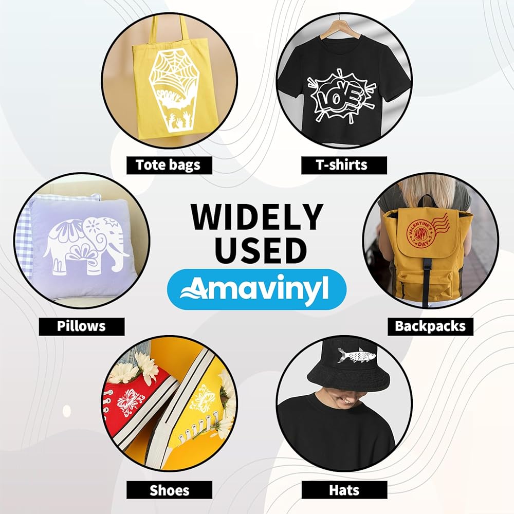 【Widely Application】Amavinyl's heat transfer film is versatile and can be used on a wide range of fabrics, including cotton, polyester, and blends. Whether you're personalizing T-shirts, hats, or bags, pillows, shoes, canvas bags and other fabrics, our HTV rolls are perfect for adding a touch of creativity to your projects. Good choice for Christmas, Halloween and anniversaries gift to your family or friends.