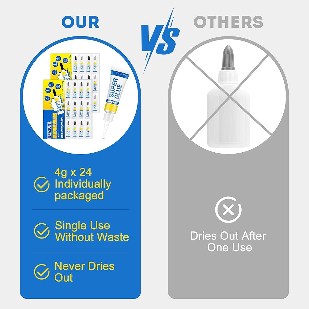 ✅قيمة رائعة مقابل أموالك: 4 جرام (عبوة من 24) جل شفاف فائق الاستخدام لمرة واحدة مصنوع من السيانوأكريليت القوي الذي يخلق روابط قوية تدوم طويلاً. أنبوب طلقة واحدة ذو سعة كبيرة 4 جرام من الغراء الفائق مناسب لمشروع صغير واحد مع التحكم الدقيق في الجرعة، ولن تقلق أبدًا بشأن نفاد الغراء مرة أخرى.