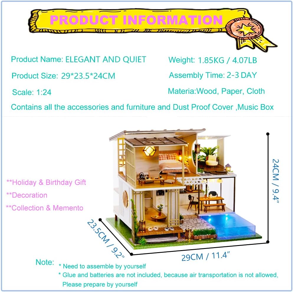 ***PACKAGE INCLUDED:The DIY Miniature Dollhouse Kit as picture display and English Instruction,we extra send a music movement and dust proof cover.The music box makes the doll house more romantic,The dust proof cover prevents the dollhouse from being contaminated by dust after completion,Finally, We have a colored Packing box that makes it look like a perfect gift.