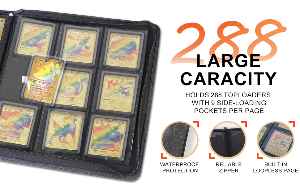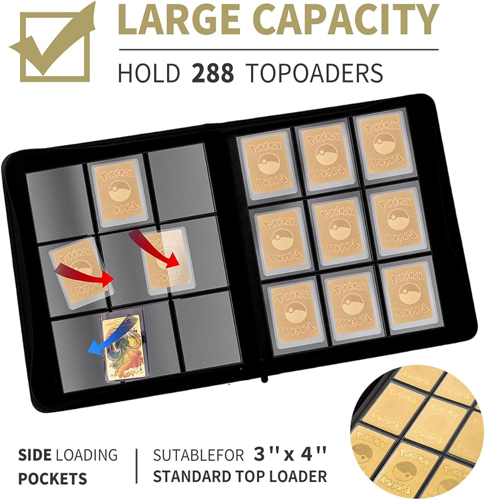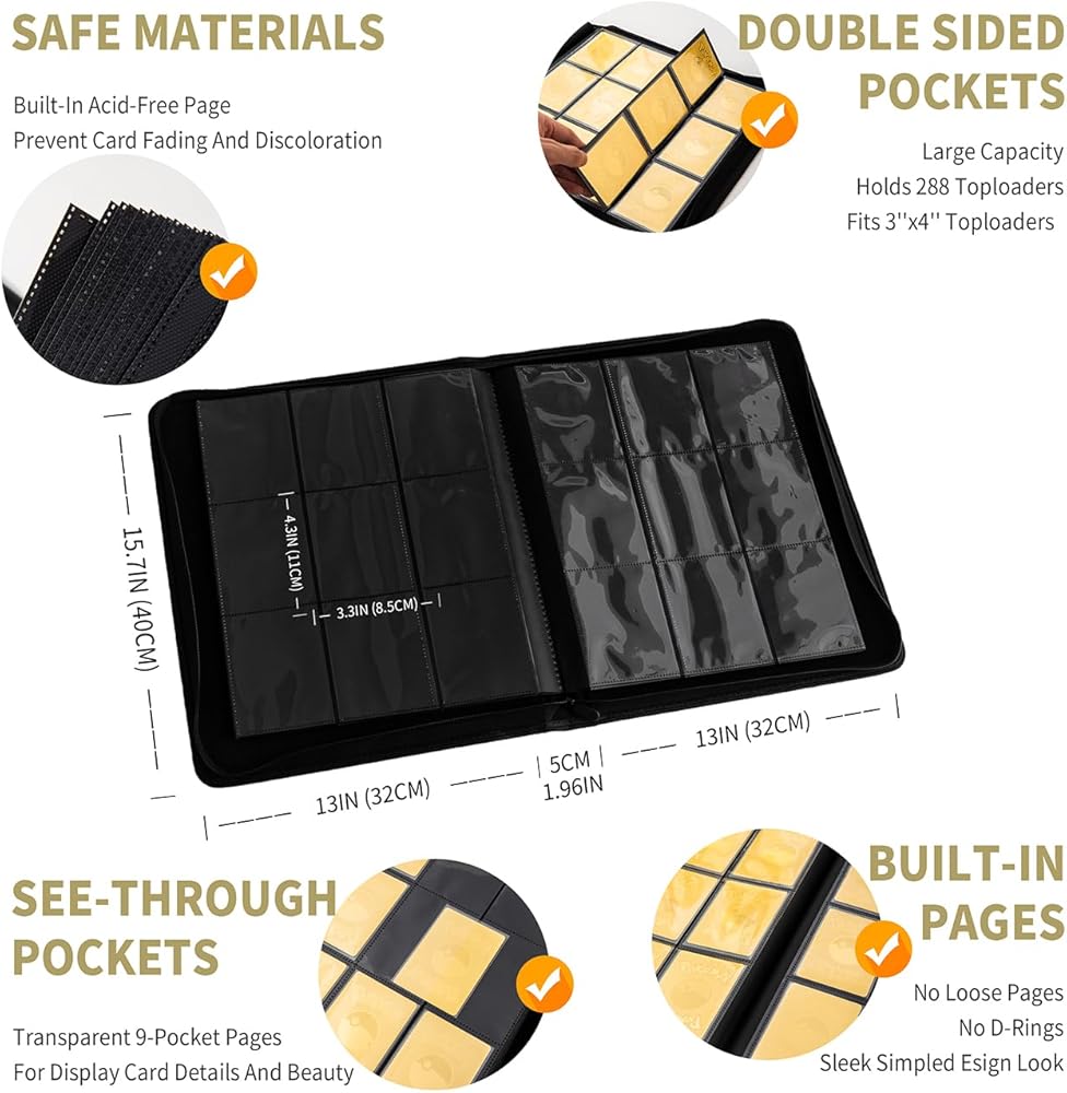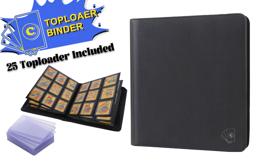 Capacity - More freedom: The Cenxaki TopLoader Binder can hold up to 288 Toploaders Card with 16 Sleeve double-sided 9-pocket pages bound to the spine with sleeves TopLoader Binder size 15.7''*12.6''*4.2 '',Pocket Size: 4.3”* 3.3”,with/Free 25 Rigid(3.0*4.0 in) Hard PVC card sleeve.