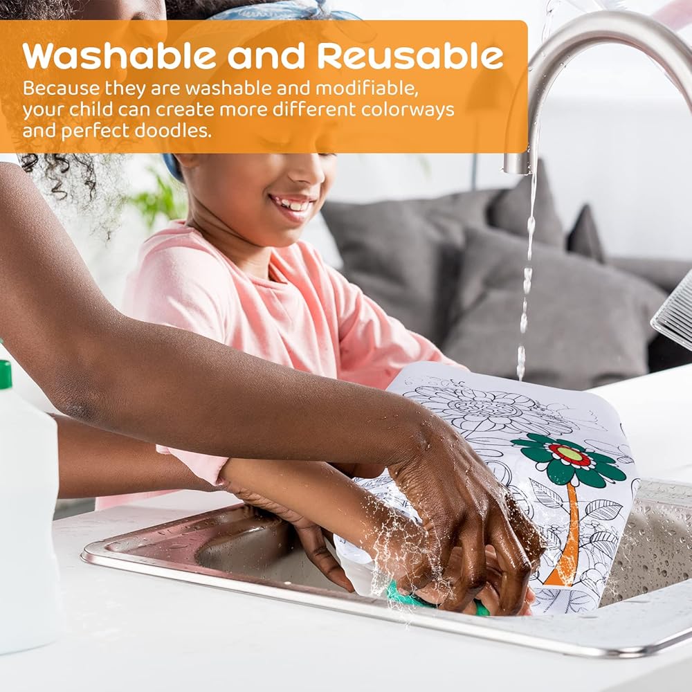 【تلوين قابل للتكرار】 أقمشة التلوين للأطفال القابلة للغسل سهلة جدًا في التلوين ولا ينزف الطلاء من الورق. نظرًا لأنها قابلة للغسل والتعديل، يمكن لطفلك إنشاء المزيد من الألوان المختلفة ورسومات الشعار المبتكرة المثالية.