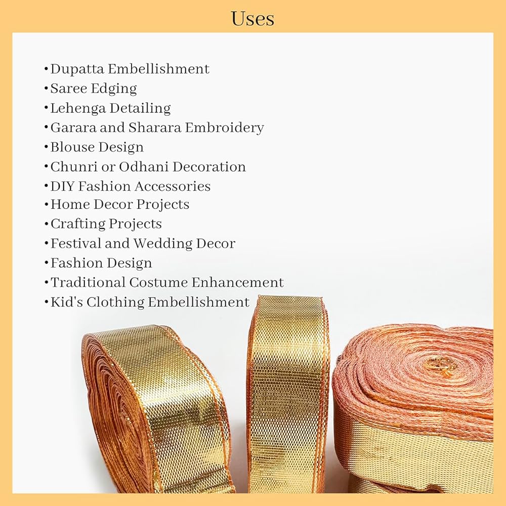• هذه الأربطة الجميلة السادة مثالية لإضافة اللمعان إلى أي ملابس تقليدية أو راقية. يتم استخدامها بشكل أساسي على حدود (كيناري) الساري الهندي واللينغا والبدلات والوشاح