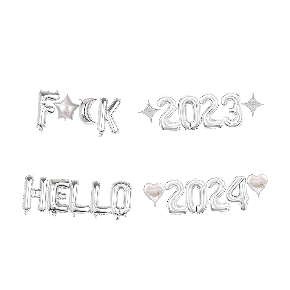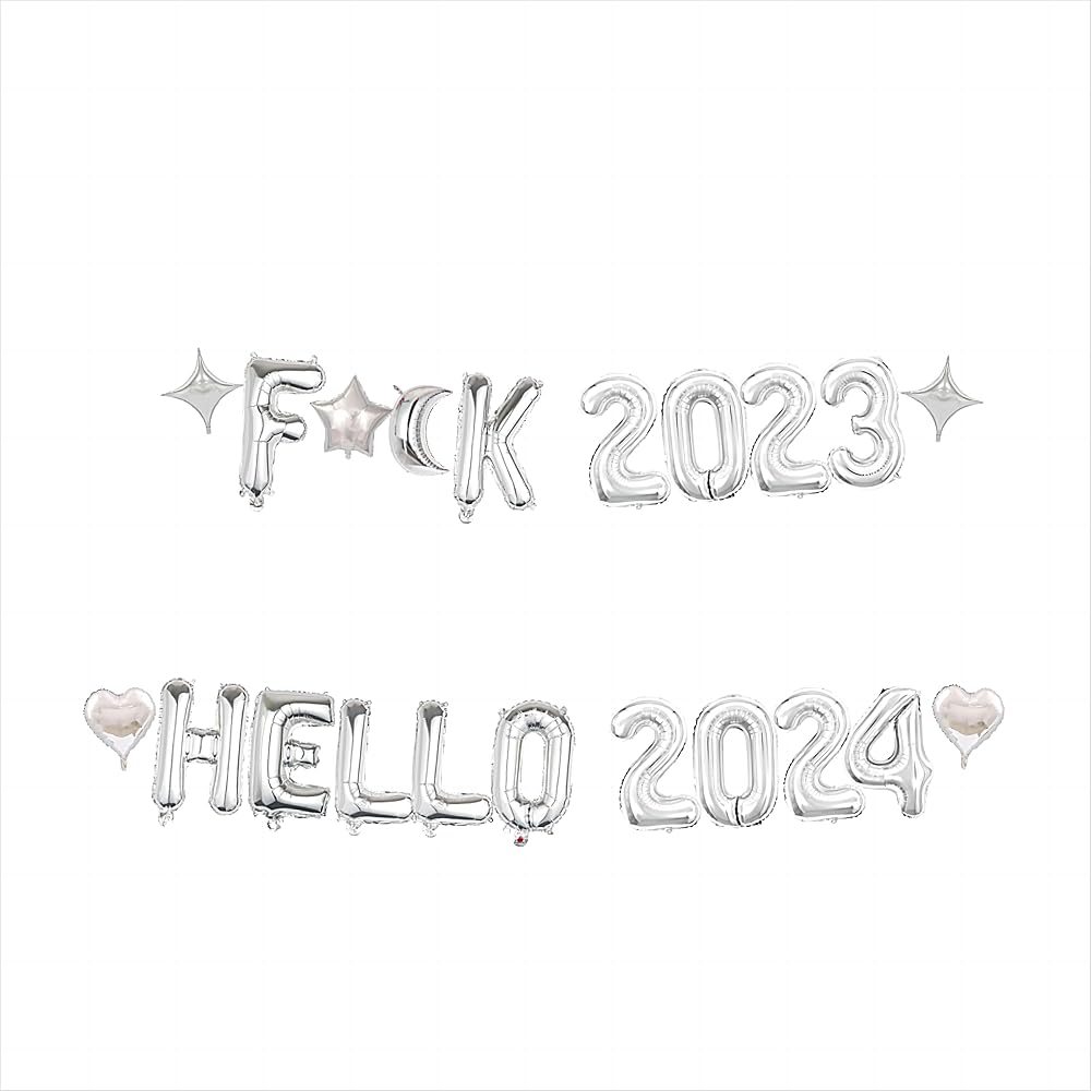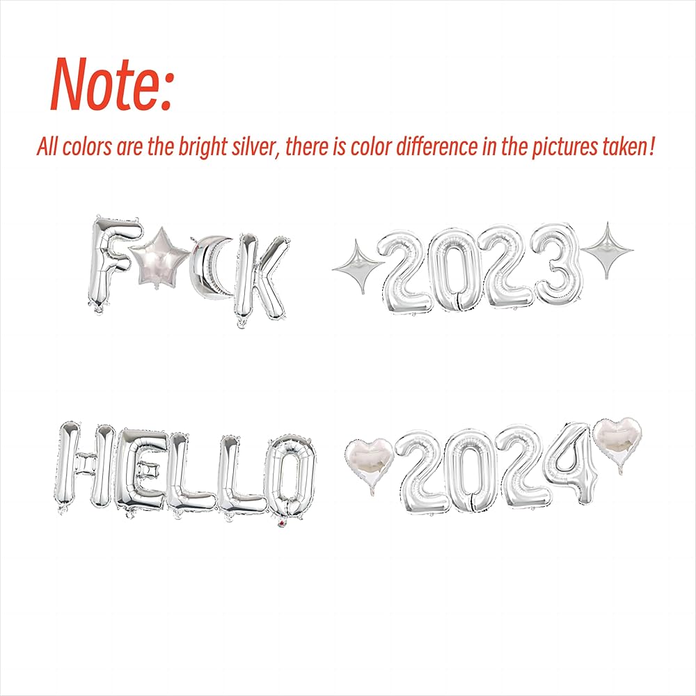 21 قطعة زينة حفلات رأس السنة الجديدة السعيدة، بالونات فضية 2024 للعام الجديد، بالونات فويل لافتة للعام الجديد