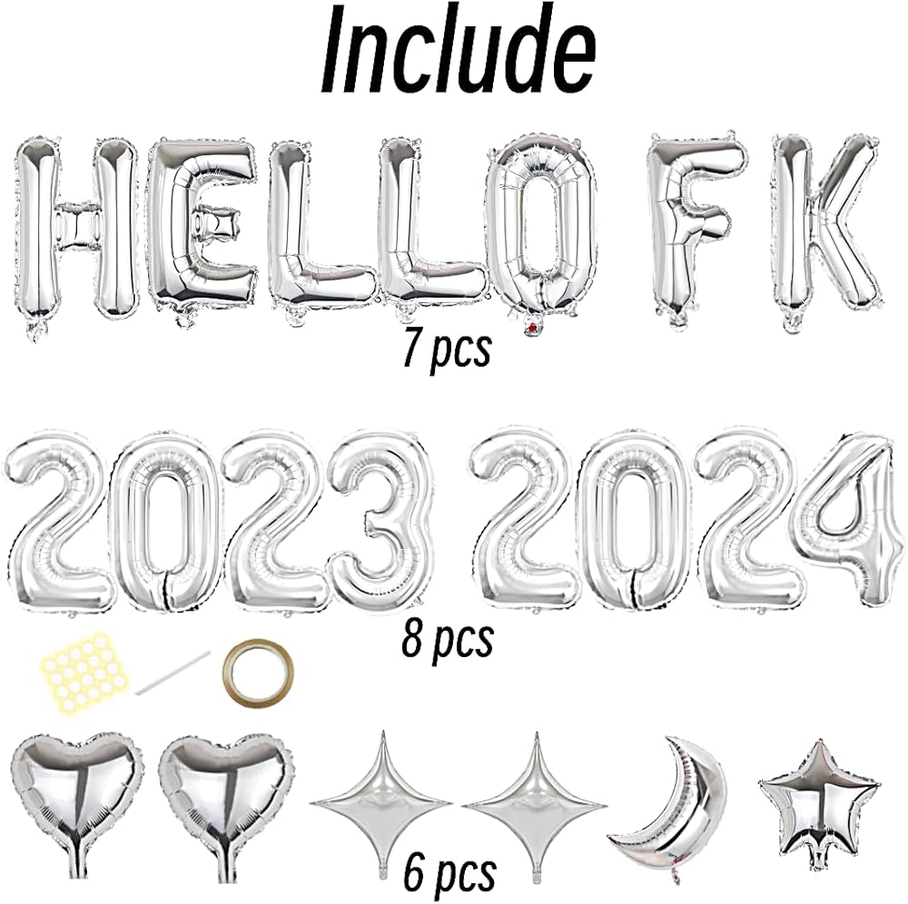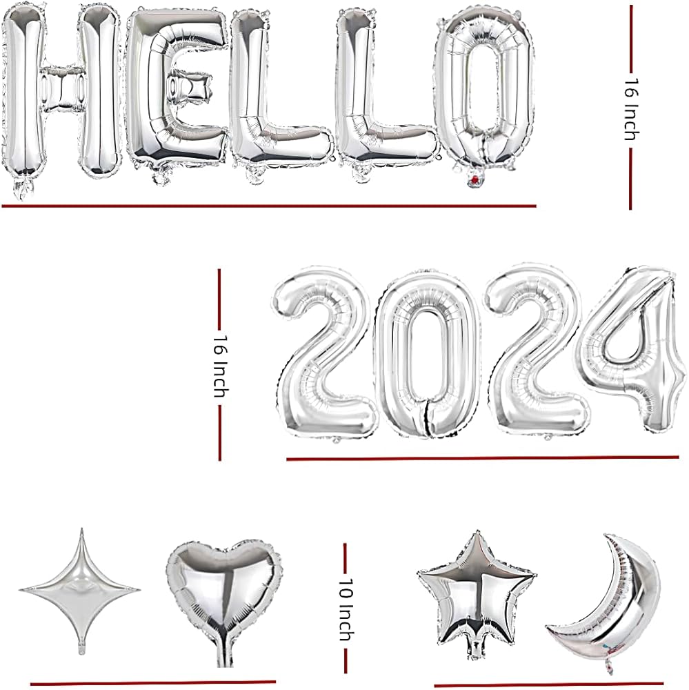 21 قطعة زينة حفلات رأس السنة السعيدة من اتش تي تي اس جي بي دبليو، بالونات فضية للعام الجديد 2024 بعبارة Hello 2024، بالونات فويل لمستلزمات الحفلات وديكور ليلة رأس السنة للمنزل والمكتب