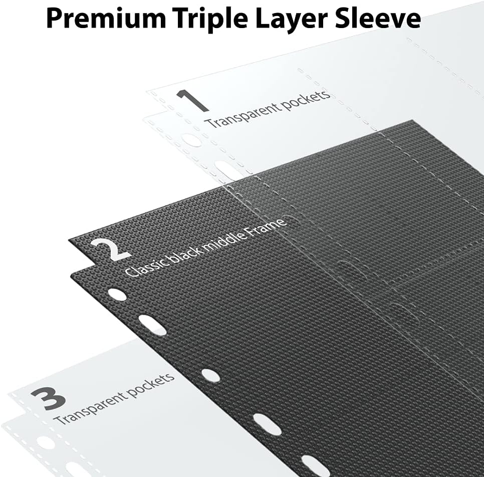 صفحات جيب ممتازة: مادة متوسطة سوداء تعطي البطاقات مظهرًا كلاسيكيًا مؤطرًا وتعزز الفن الموجود على كل بطاقة. مصنوعة من مادة آمنة أرشيفية وخالية من الأحماض وغير PVC. جيوب تحميل علوية، مصممة للحفاظ على البطاقات في مكانها بشكل آمن، ولا مزيد من انسكابات البطاقات.