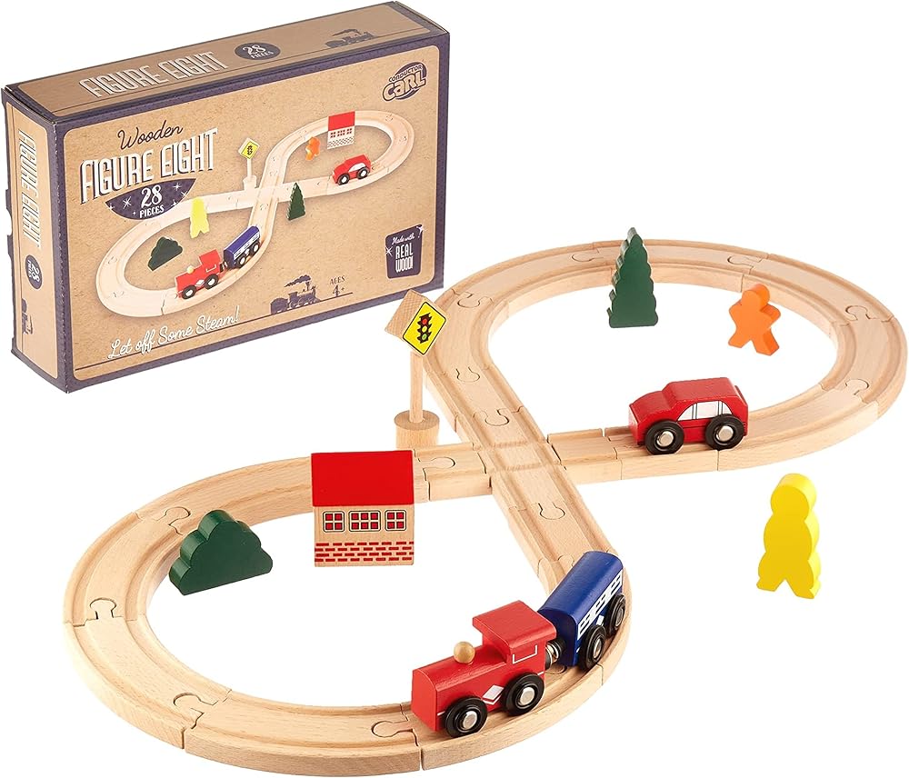 مجموعة السكك الحديدية الشكل 8، 28 قطعة - مجموعة مسارات قطار خشبية مع سيارات القطارات وقطع المدينة والأشخاص والمسارات - متوافقة مع قطارات الألعاب الخشبية الرئيسية - الألعاب والألعاب والهوايات والأنشطة لمتعة العائلة