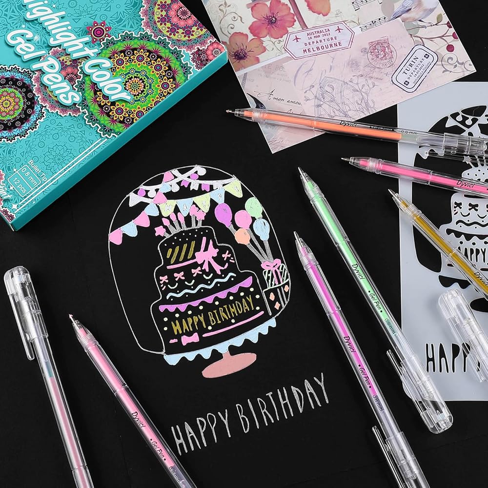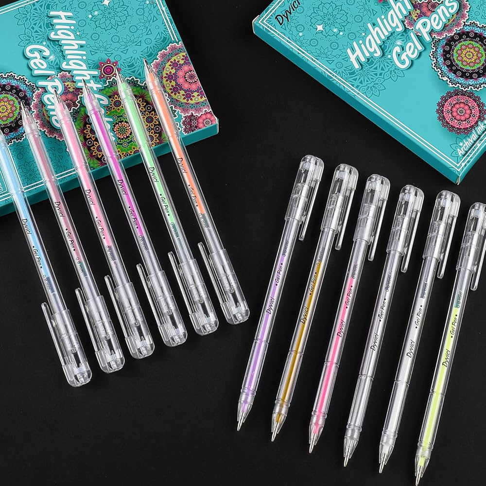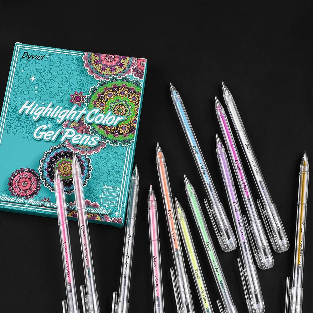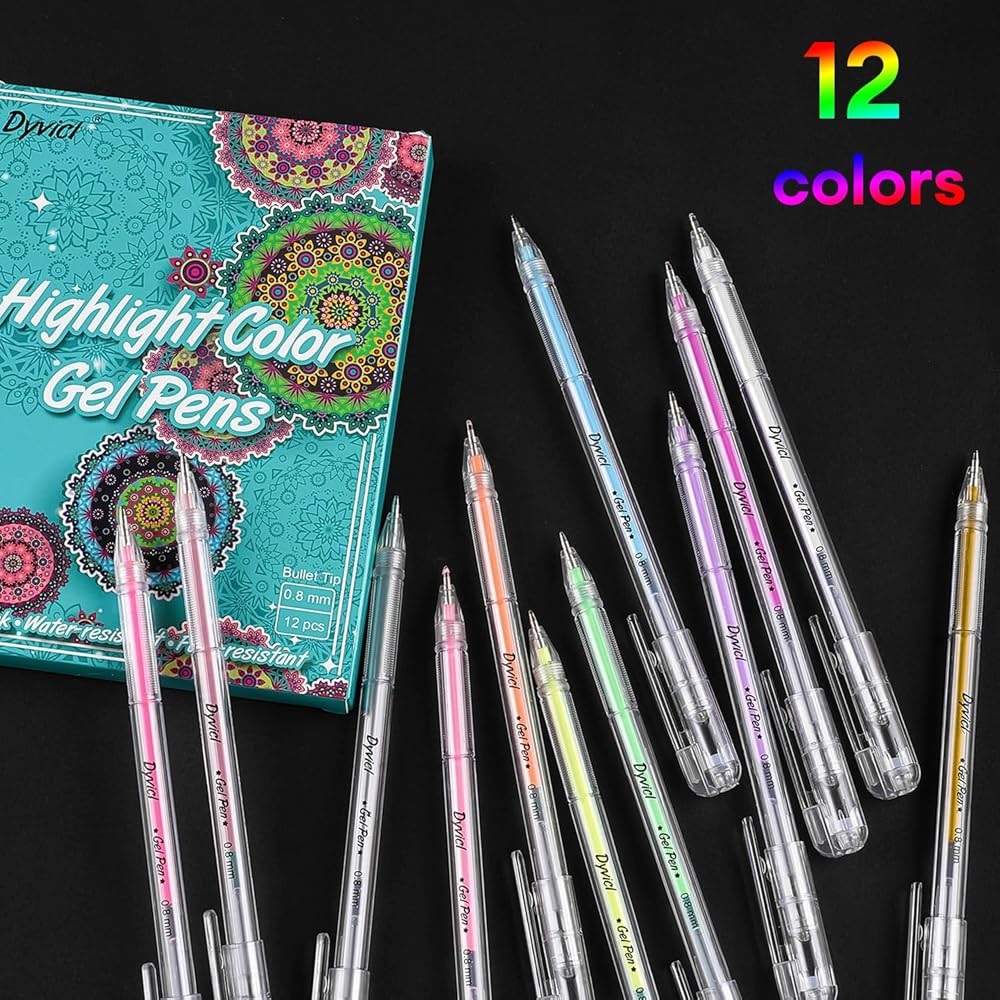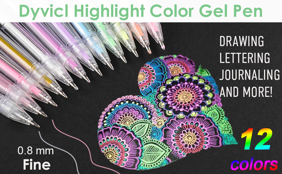 أقلام تلوين تسليط الضوء من Dyvicl، أقلام حبر هلامية ذات نقاط دقيقة مقاس 0.8 مم لرسم الورق الأسود، والرسم، والتوضيح، وتلوين البالغين، واليوميات، مجموعة من 12 قطعة