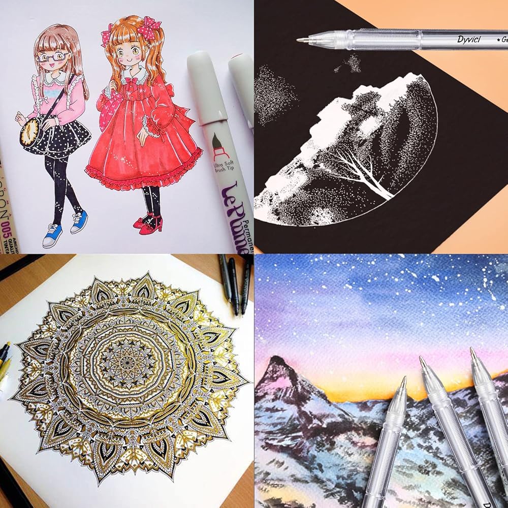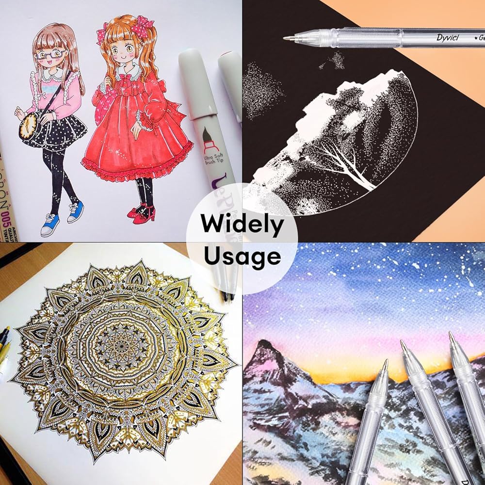 استخدام واسع النطاق - هذه الأقلام الملونة الدقيقة لبعض المشروعات التنقيطية على الورق الأسود، ورسم التفاصيل، والتلوين، والرسوم التوضيحية، ومجلة الكتاب المقدس، وصناعة البطاقات، ودفتر القصاصات، والأظرف السوداء، وملاحظات العصا السوداء، وكتاب الصور، والزنتانجل، والماندالا، وكتاب تلوين للبالغين وغيرها من المشروعات ممتاز للرسم والكتابة على الصخور.