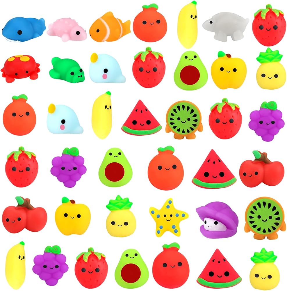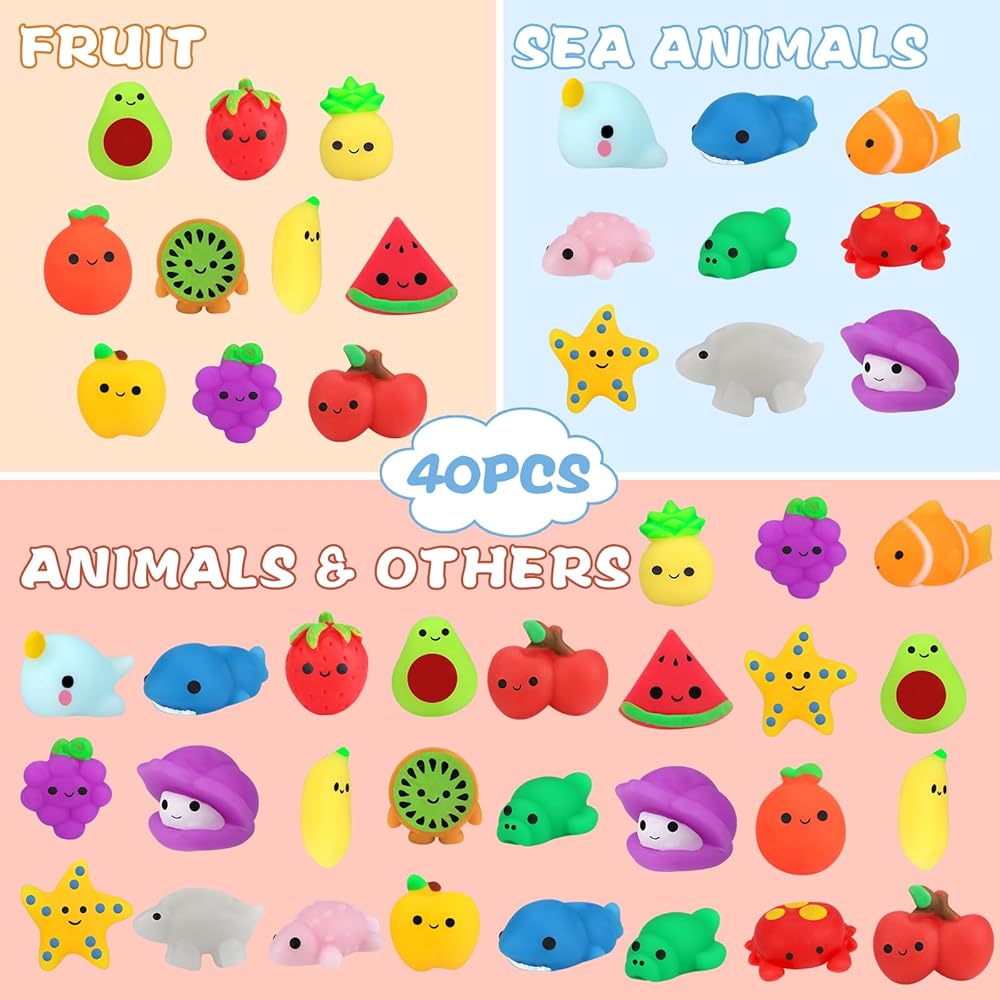تتضمن العبوة - 40 قطعة من حيوانات كاواي موتشي وألعاب الفاكهة بأشكال مختلفة في صندوق جميل، بما في ذلك موتشي وحيد القرن والديناصور والسلحفاة والفيل والثعلب والباندا والبطريق والقطط والبط والتفاح والموز، إلخ. الحجم حوالي 5 سم/ 1.9 بوصة. تحتوي كل لعبة لتخفيف التوتر على عبوة فردية، فهي لطيفة جدًا وصغيرة الحجم. يمكنك وضعه في جيبك وحمله بسهولة.