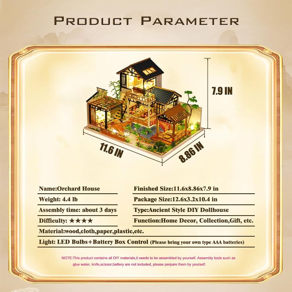 🌻Music movement and Dustcover: This product includes a music movement and 5 pieces of dustcover covered with brown paper, the default music of music movement is: Castle in the sky, and Dustcover will keep your dollhouse clean and prevent scratches.