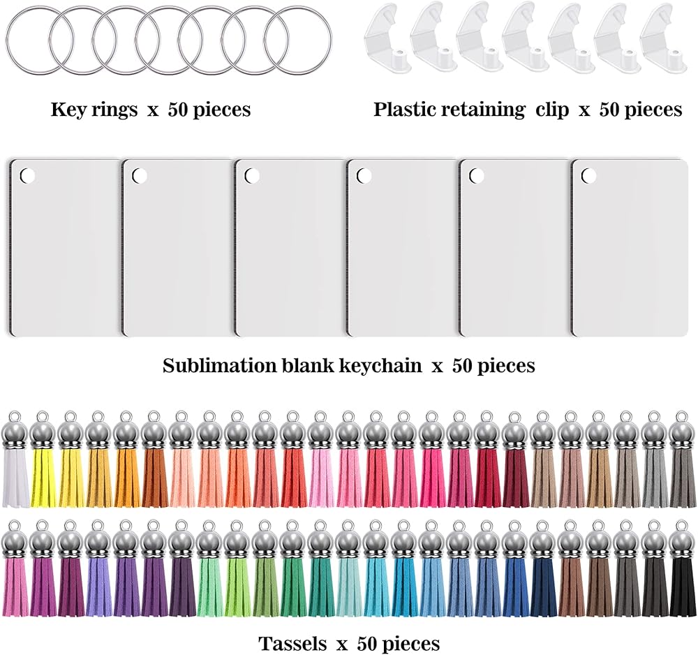 مجموعة فراغات سلسلة مفاتيح التسامي: تتضمن العبوة 50 قطعة فارغة من سلسلة مفاتيح التسامي مستطيلة، 50 قطعة حلقات مفاتيح، 50 قطعة مشابك بلاستيكية للاحتفاظ و50 قطعة شرابات سلسلة مفاتيح ملونة، 200 قطعة حلقات مفاتيح فارغة مجموعة كاملة، كمية ولون مناسبين لتلبية احتياجاتك المختلفة
