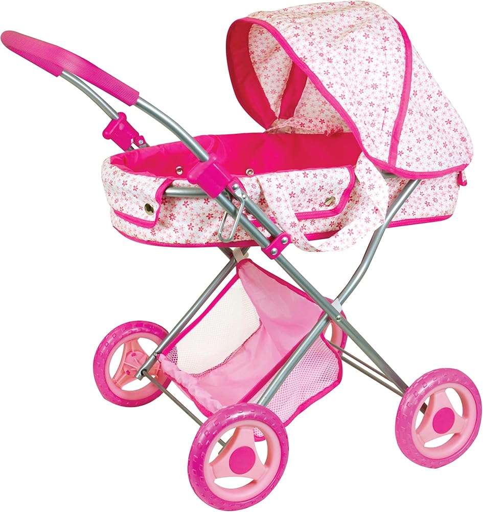 خذ دمى طفلك في جولة في عربة الأطفال الجميلة هذه. يخرج سرير عربة الأطفال ويمكن استخدامه كحامل. توجد مساحة تخزين كبيرة أسفل عربة الأطفال لوضع حقيبة الحفاضات المتضمنة و4 ملحقات. تأتي مع دمية طفل مقاس 13 بوصة.