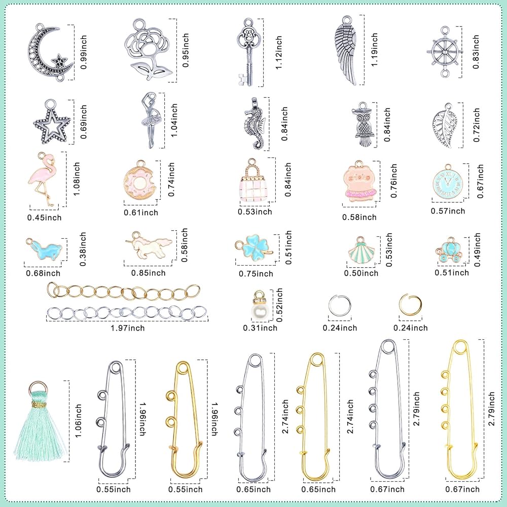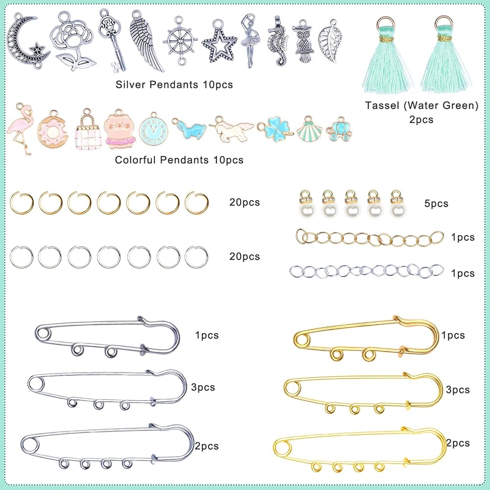 【Package Including】 This Brooch Making kit comes with 12 safety pins, 10 silver pendants, 10 colorful pendants,5 faux pearls pendants, 40 open jump rings, 2 chains, 2 tassels.