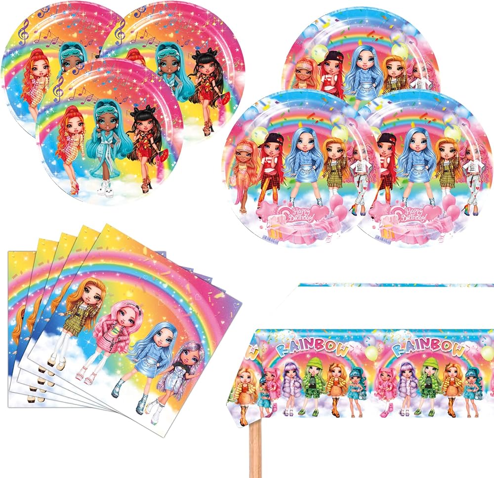 لوازم حفلات أعياد الميلاد العالية من قوس قزح، 20 طبقًا و20 منديلًا وغطاء طاولة واحد للفتيات من لوازم الحفلات ذات الدمى العالية من قوس قزح