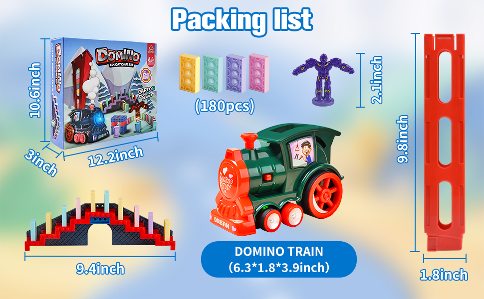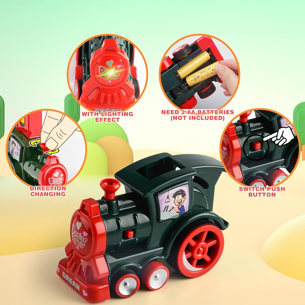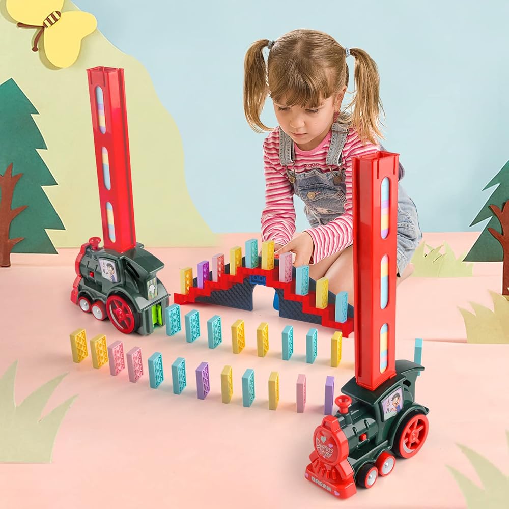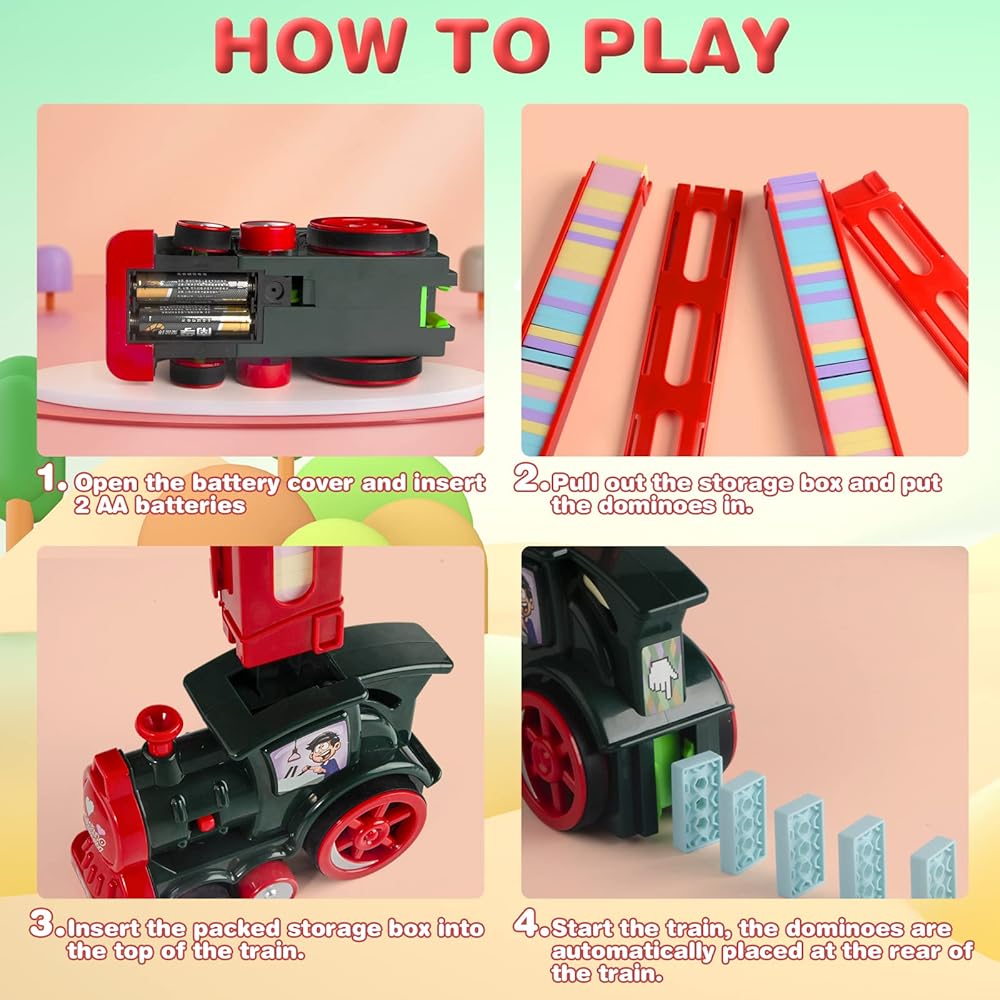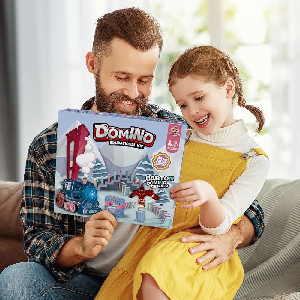 مجموعة دومينو سهلة التركيب والانطلاق - ببساطة بالضغط على مجلة الدومينو سريعة التحميل على الدومينو، ترتفع مكعباتك الملونة إلى الحامل وتبقى هناك حتى يطلقها القطار أثناء سفرها على الأرض أو الطاولة، تاركًا صفًا مثاليًا من الدومينو في انتظار سقوطها.