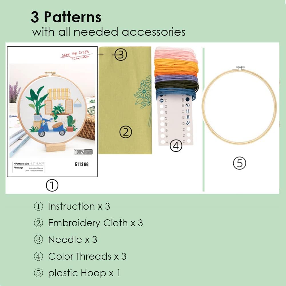 ماذا يوجد في الصندوق؟ - تتضمن المجموعة كل ما تحتاجه، بما في ذلك الطوق × 1، وقطعة قماش مطرزة بنمط × 3، وإبر × 3 وخيوط عالية الجودة، بالإضافة إلى 3 تعليمات خطوة بخطوة.
