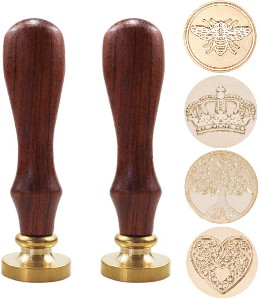مجموعة طوابع ختم الشمع، فانكنونو 4 قطع طوابع شمع ختم أختام نحاسية + 2 قطعة مقبض خشبي، مجموعة ختم الشمع الرجعية العتيقة لأظرف البطاقات، والدعوات، وحزم النبيذ (التاج، شجرة الحياة، الحب، النحل)